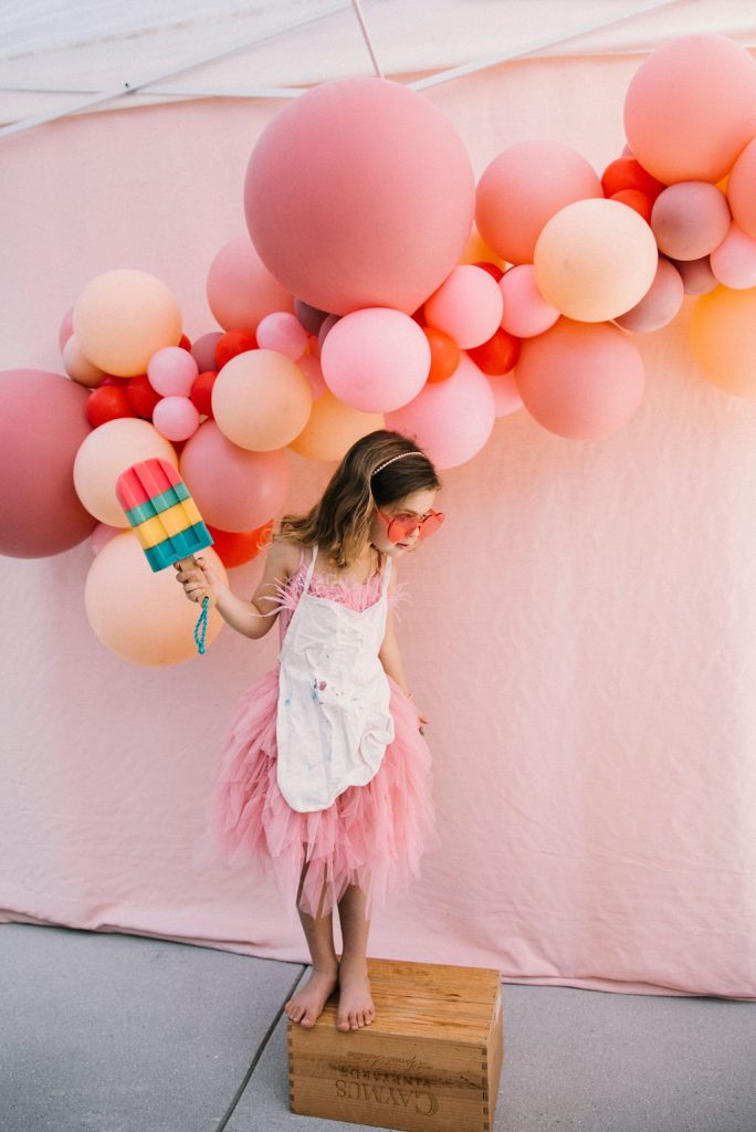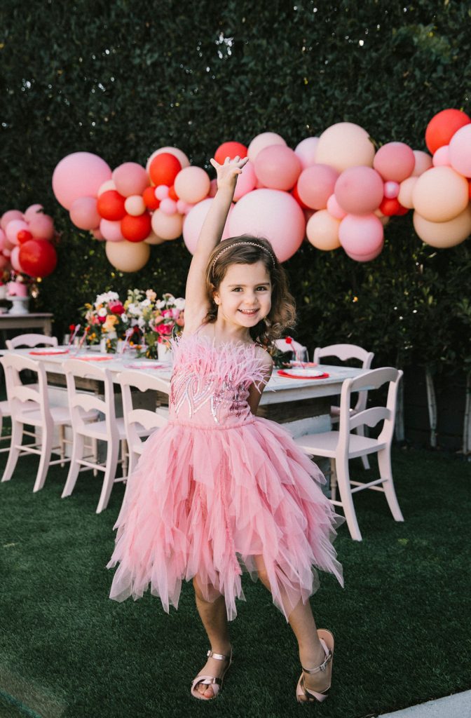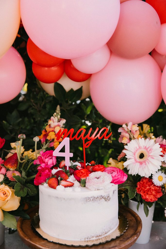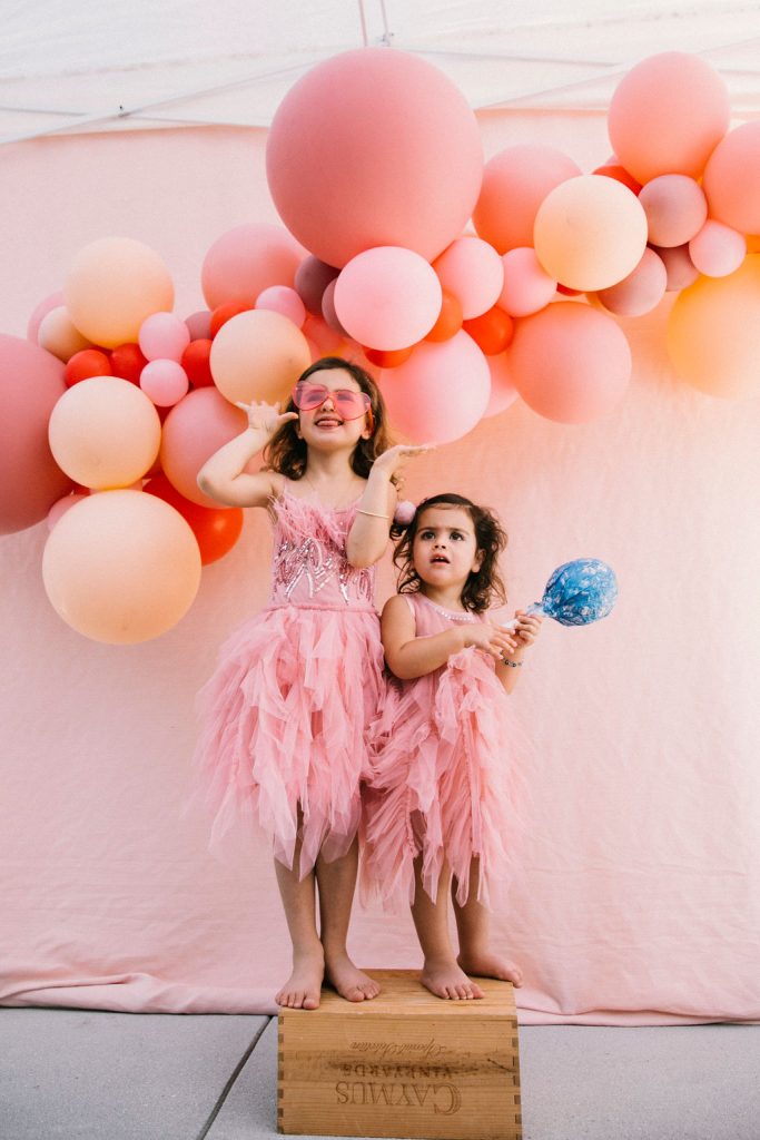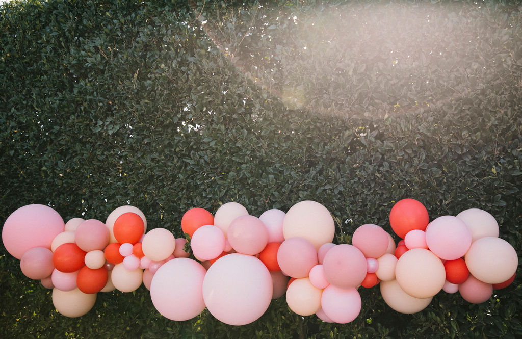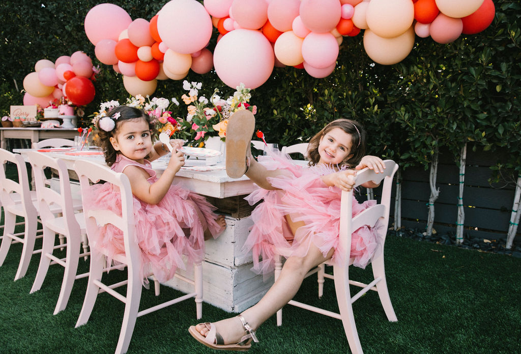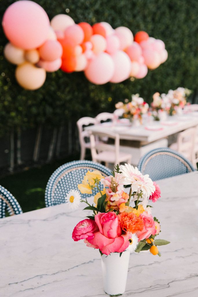 Our adorable table was set in the backyard. I had fun using Sweet Salvage Rentals’ precious pink chairs and a white table layered on crates. They reminded me of something you’d put strawberries in on the farm! There were lots more balloons by The Pop Shop! We weren’t holding back on this one!!