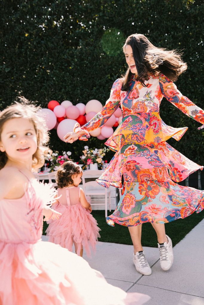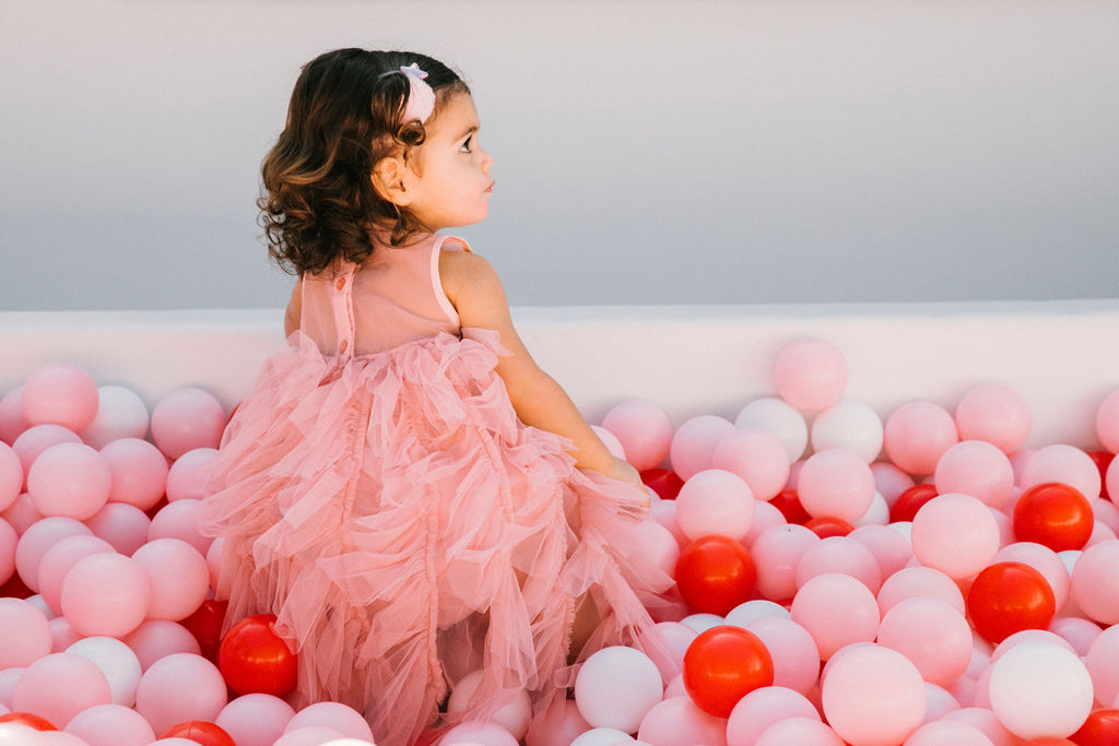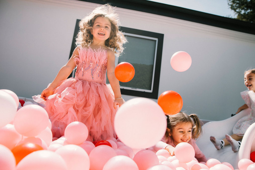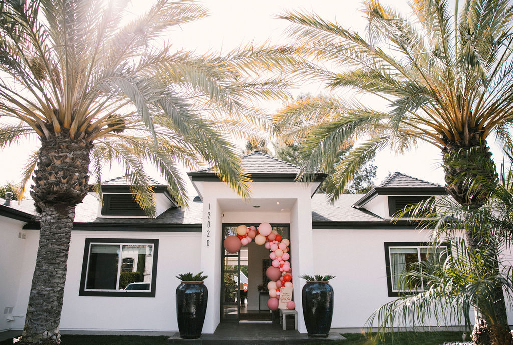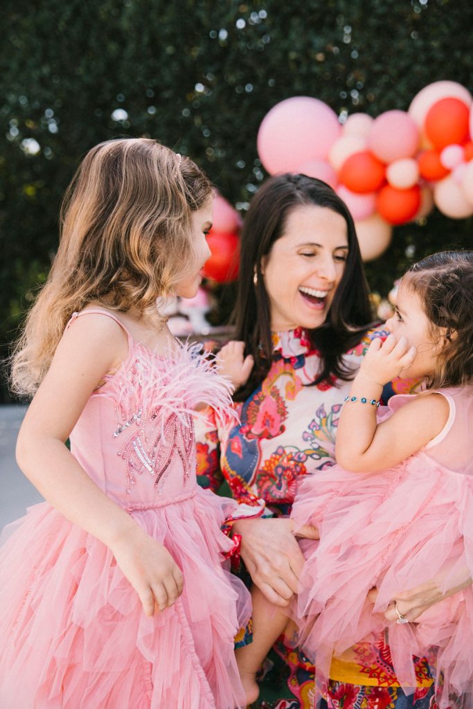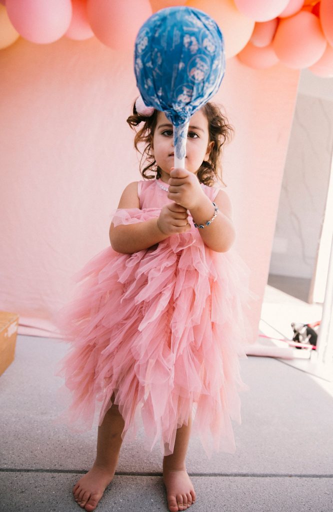 Our adorable table was set in the backyard. I had fun using Sweet Salvage Rentals’ precious pink chairs and a white table layered on crates. They reminded me of something you’d put strawberries in on the farm! There were lots more balloons by The Pop Shop! We weren’t holding back on this one!!