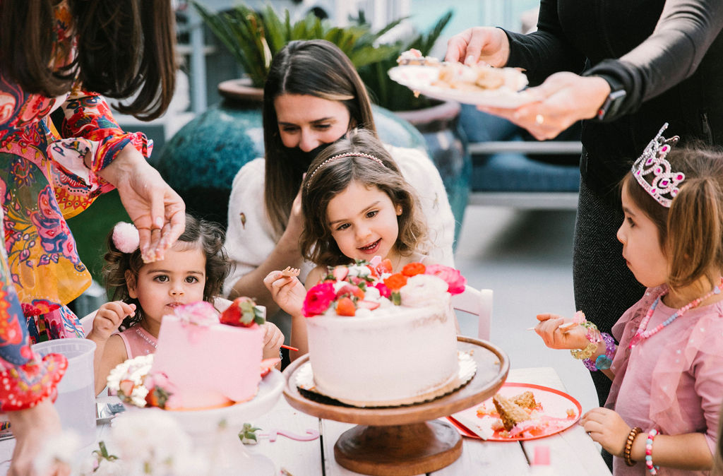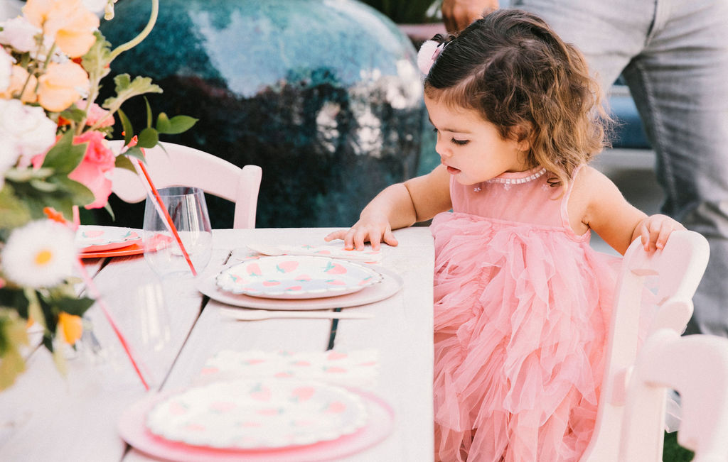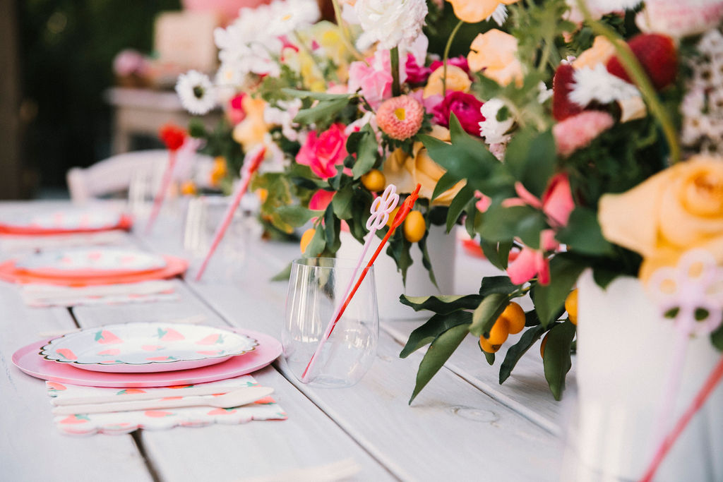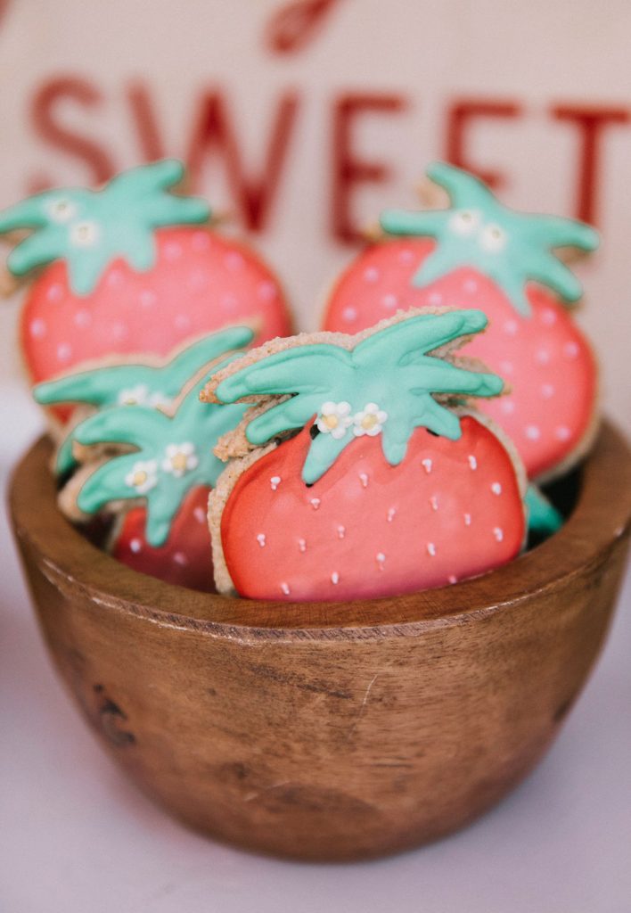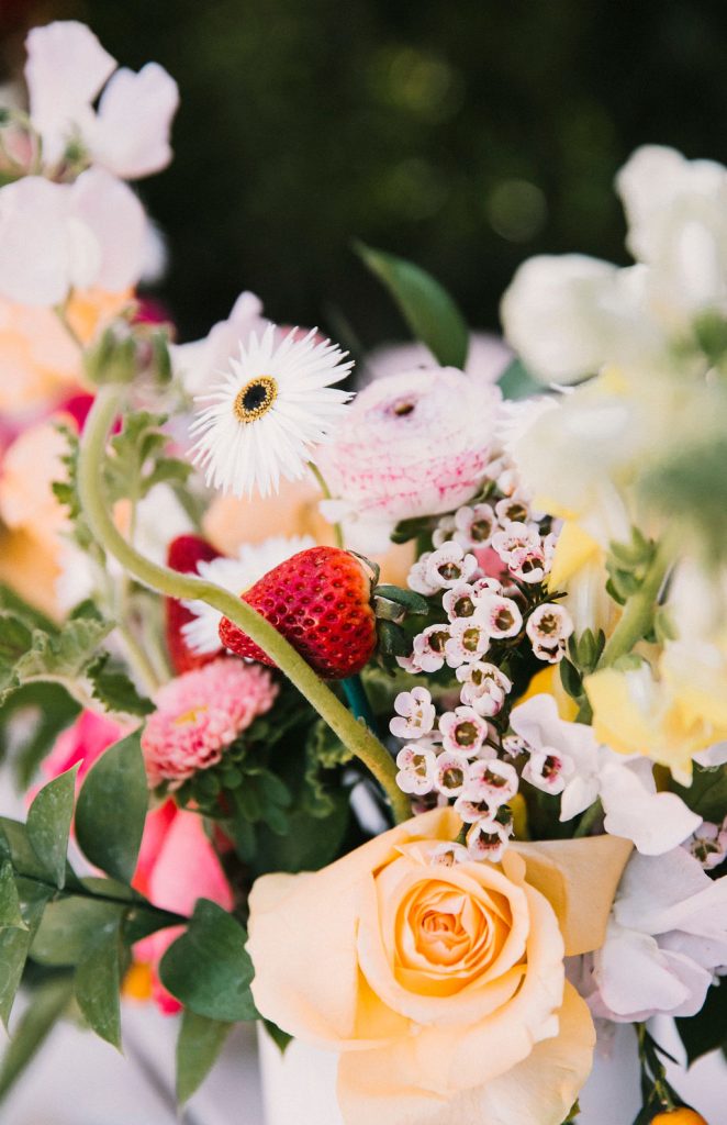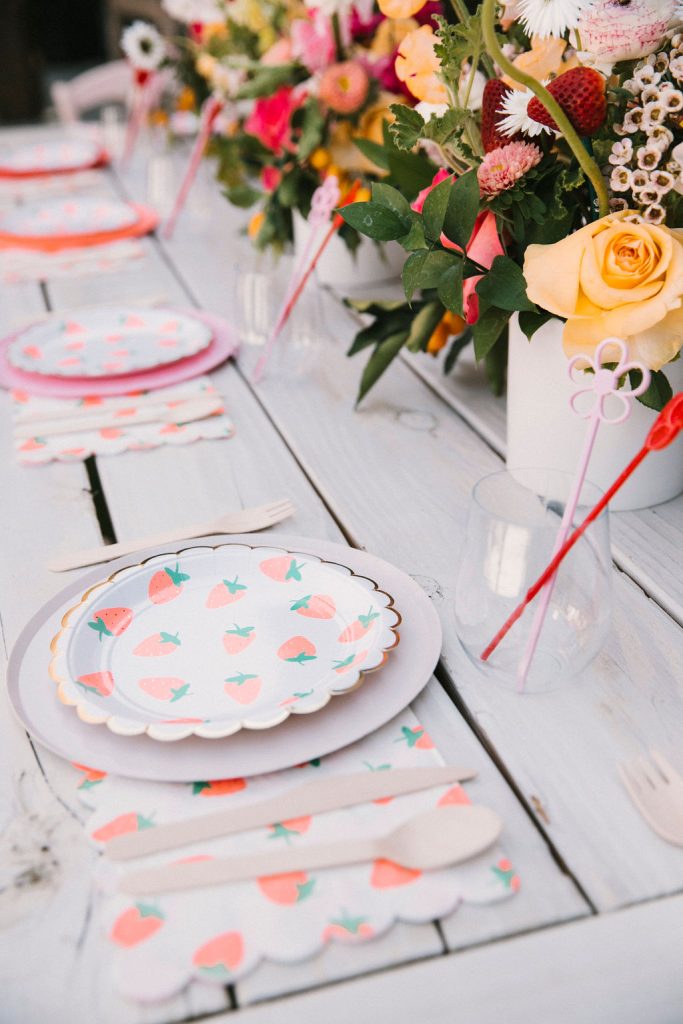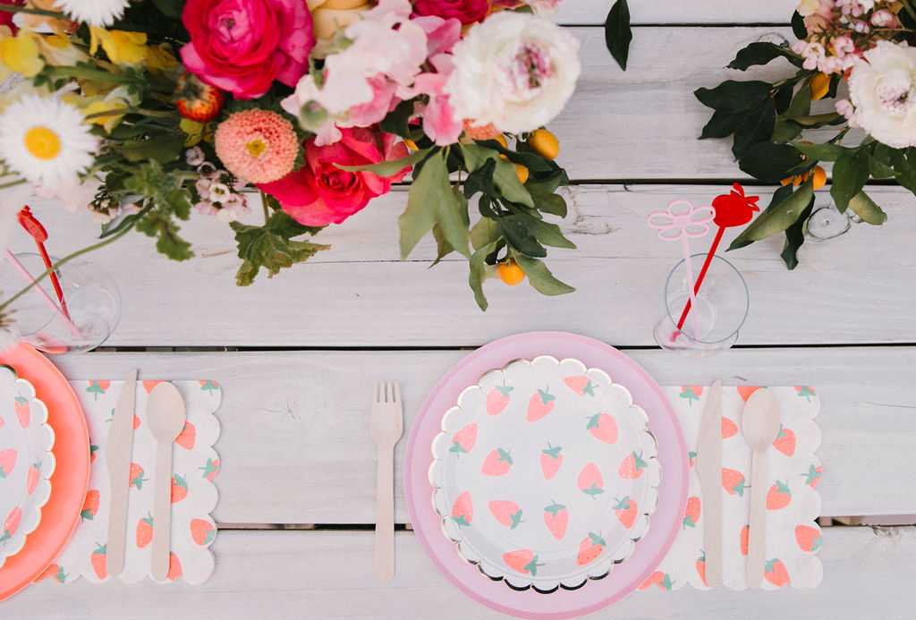 The tables were adorned with gorgeous floral arrangements by Cobra Lily! He even added fresh strawberries to the arrangements!!! And of course, we set the place settings with the most adorable plates from Meri Meri & Oh Happy Day Party Shop.