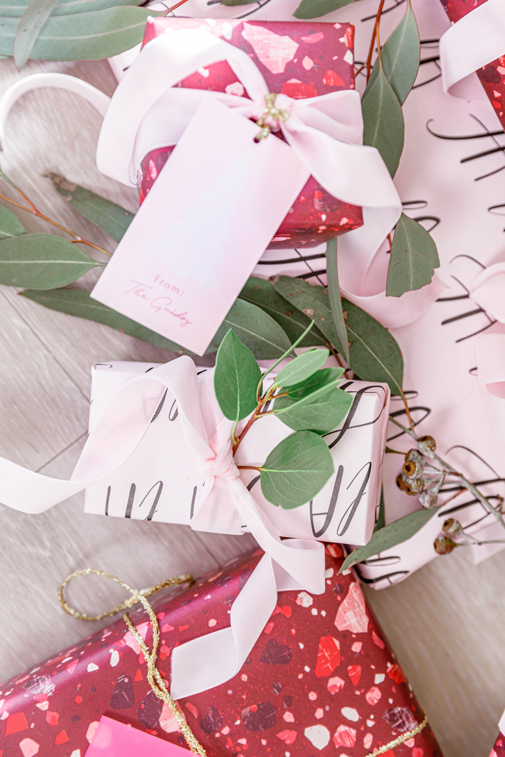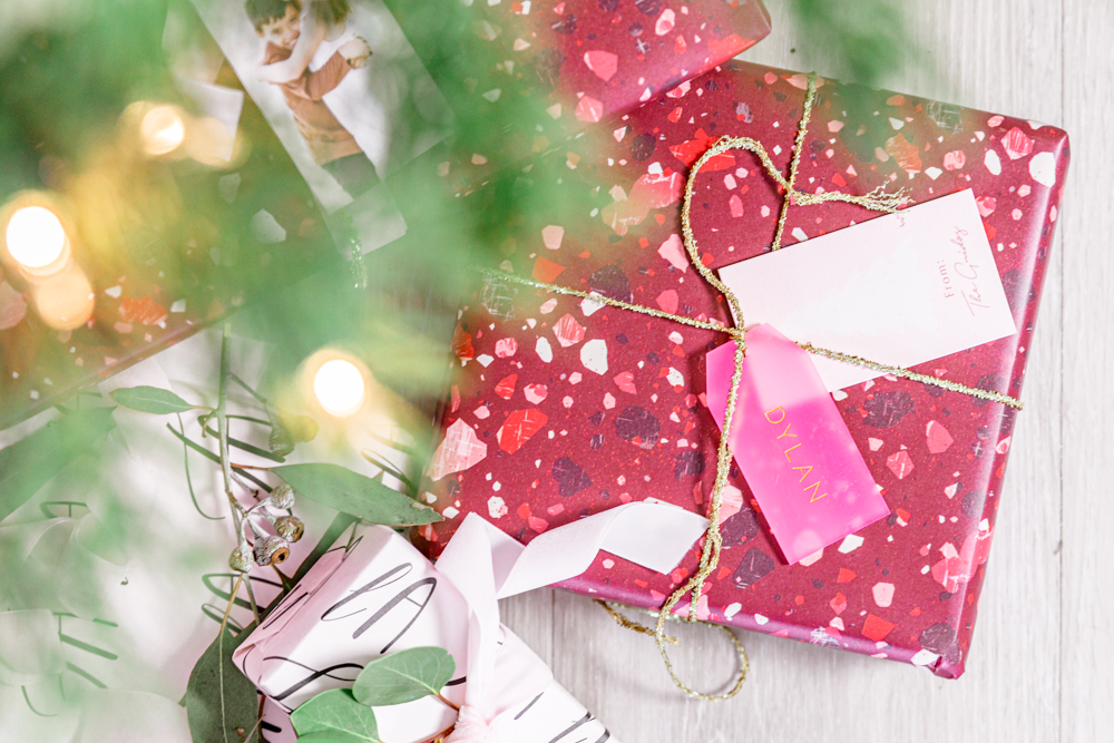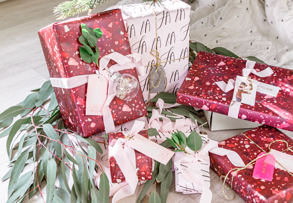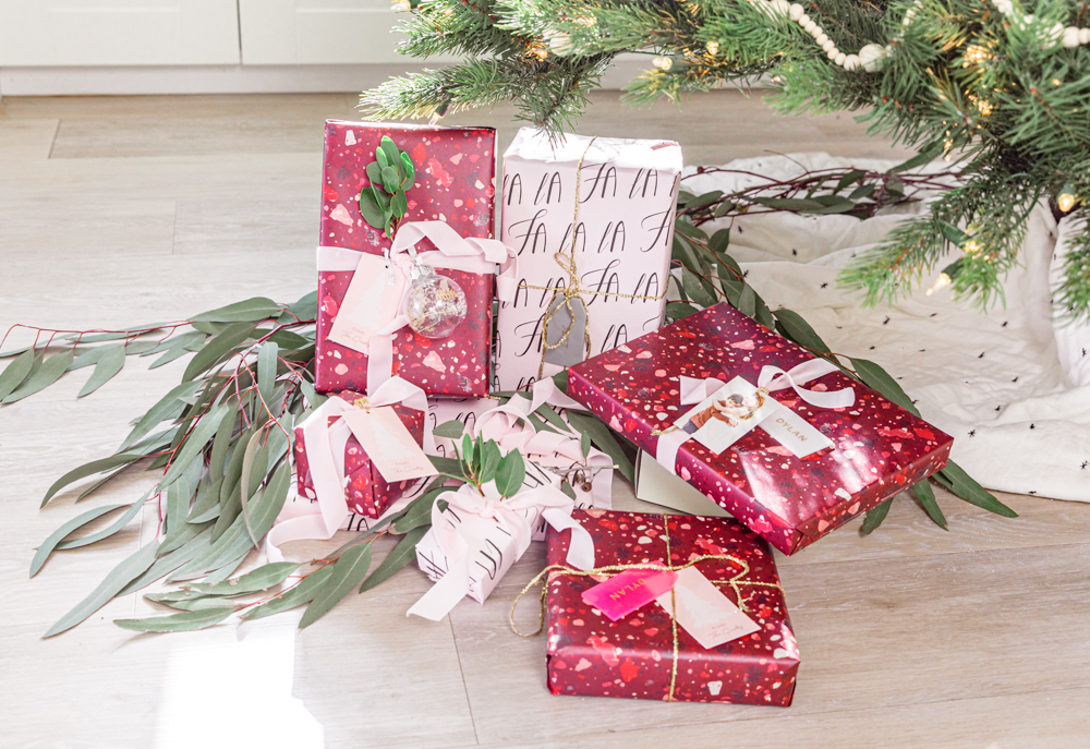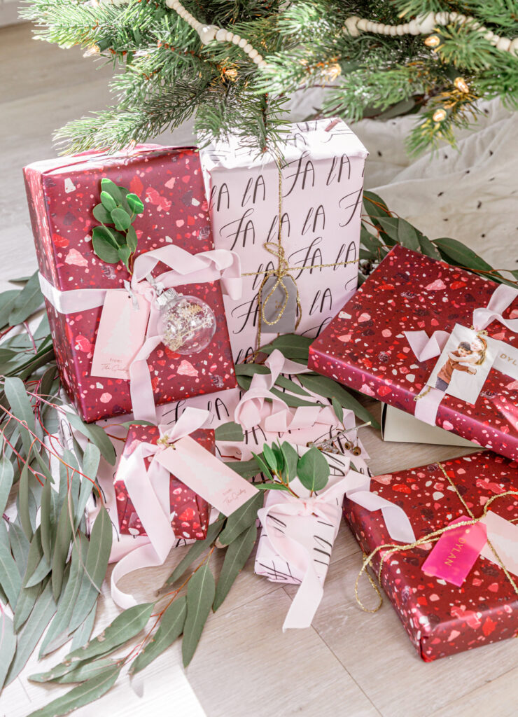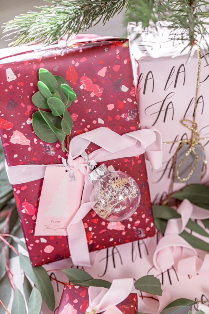 It’s funny, I’m obsessed with finding the perfect wrapping paper and festive details, but dred the actual activity of wrapping. This year, it was hard to not have fun with Minted’s wrapping paper! I fell in love with their Sugarplum collection. Its full of pinks and berry colors, watercolor accents, and sparkly gold accents. The Berry Terrazzo wrapping paper by Amy Payne was the 1st that caught my eye. Its full of color, and who doesn’t love a terrazzo pattern. I paired the Berry Terrazzo up with the fun Fa La La wrapping paper by Caitlin Considine. I didn’t realize at the time when I picked it out ,that it has a pretty light pink background. Pleasant surprise.