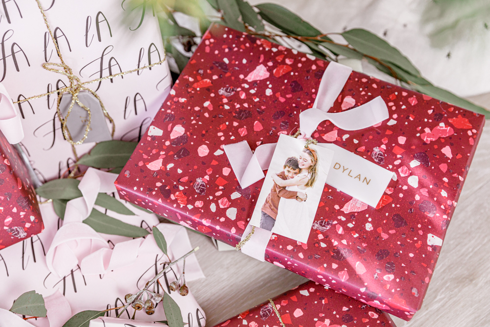 Now for the details! I love adding ribbon, tags, and even fresh greenery to my gifts. There is nothing better then a good velvet ribbon, and this blush velvet ribbon is a luxurious finishing touch for your holiday gifts. Add a little sparkle with this gold glitter ribbon. This probably my favorite detail this year is the custom gift tag! You can add a photo and personalize with your name on it. So cute, right?!? I picked the Glided Forest gift tag by Rebecca Rueth. All put together, they make a pretty collection if you ask me. I know our family and friends will really love them!