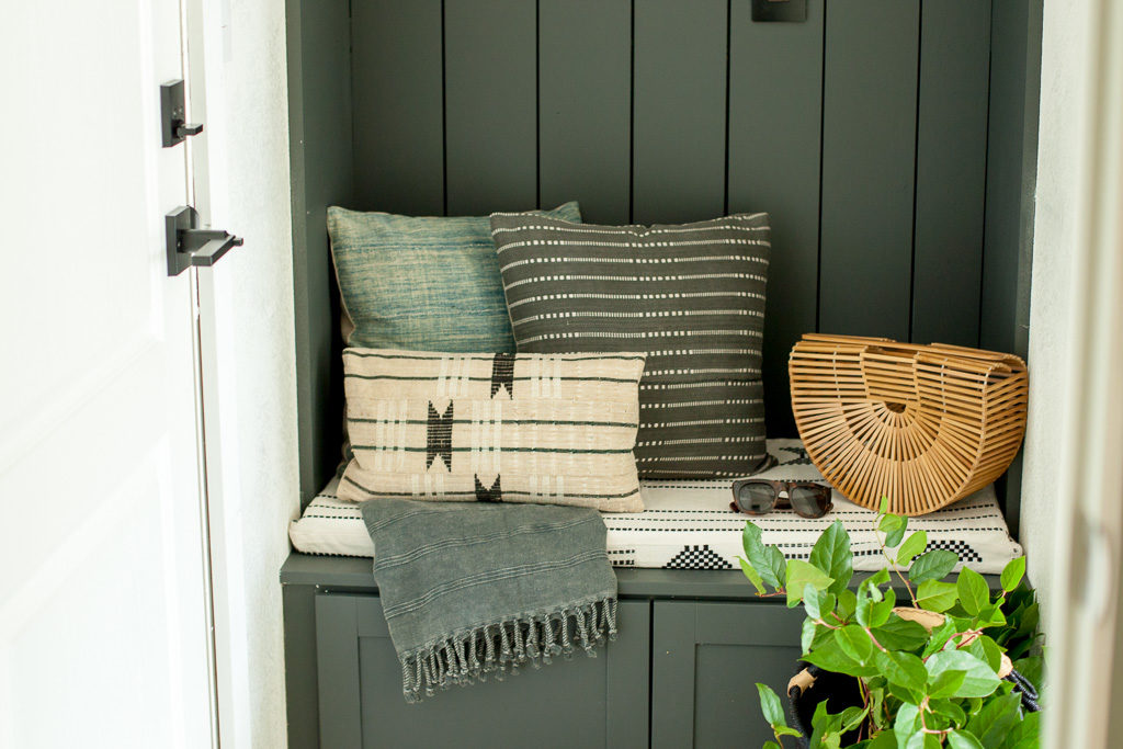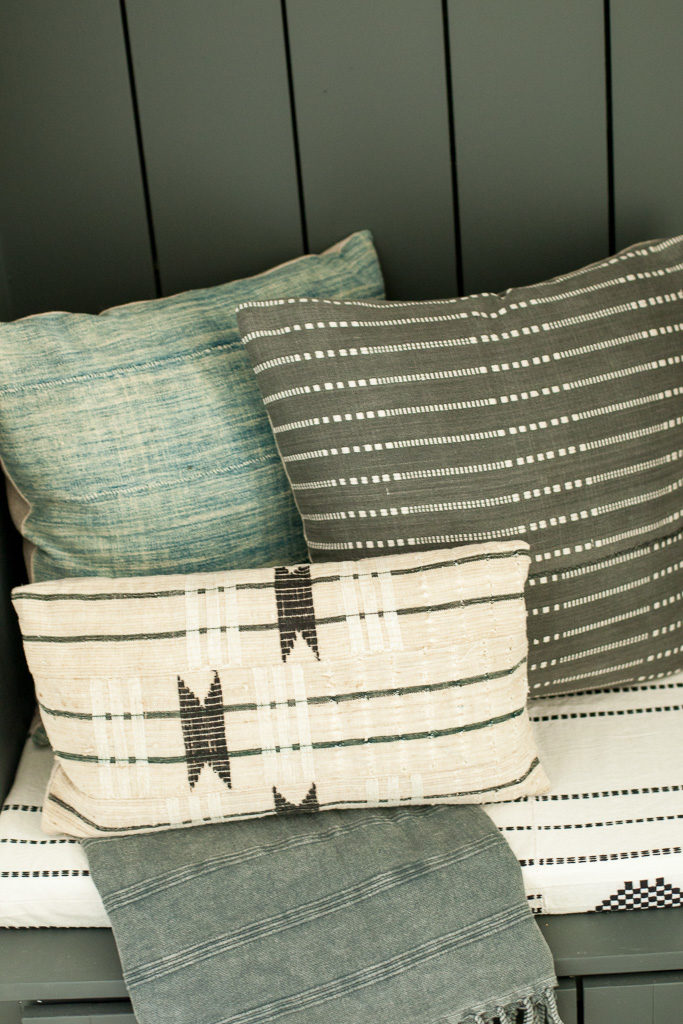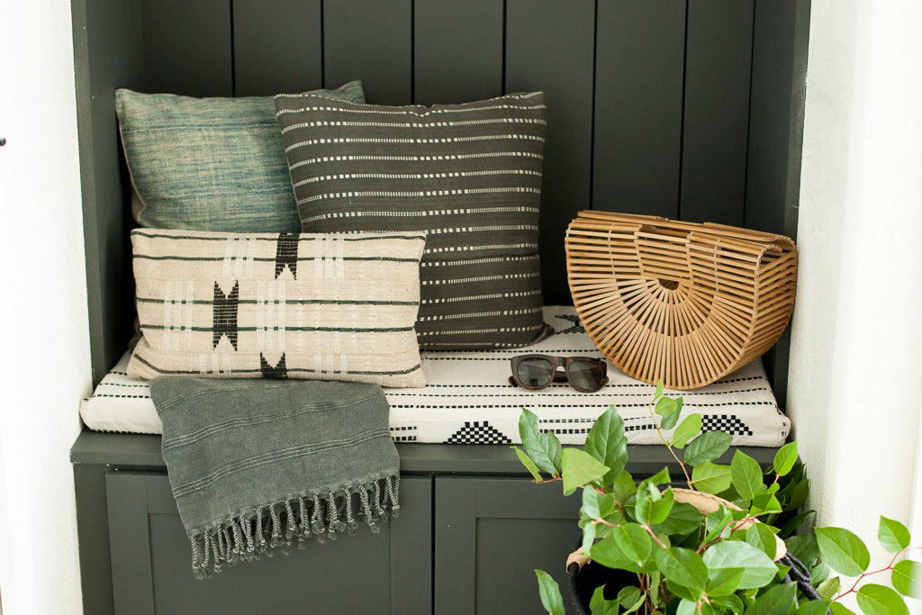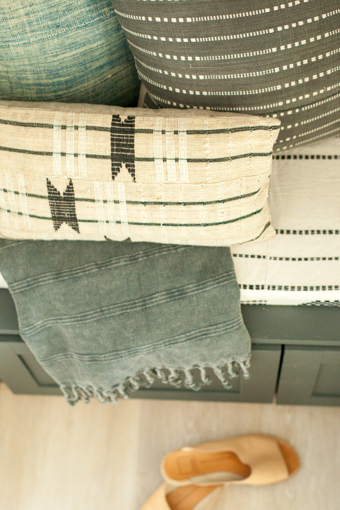 Now, the most critical part of this dropzone is it looking cute. Yes, functionality is important, blah blah, but it’s gotta be looking right at the end of the day. I turned to my pillow dealer, Monica from Boho Pillows to start pulling new textures and prints for the house. This was our 1st area to work with. My last house had a TON of her pillows, but we needed new ones to go with the black and white palette. She created a custom cushion, and corresponding pillows to go with it. Pretty cute, huh?