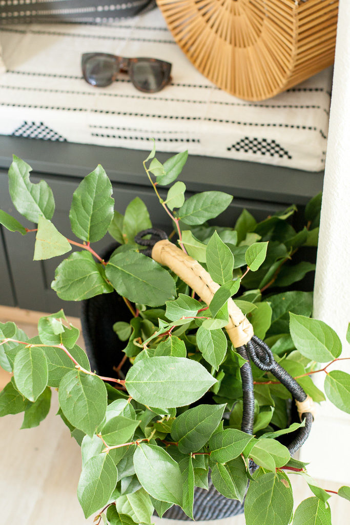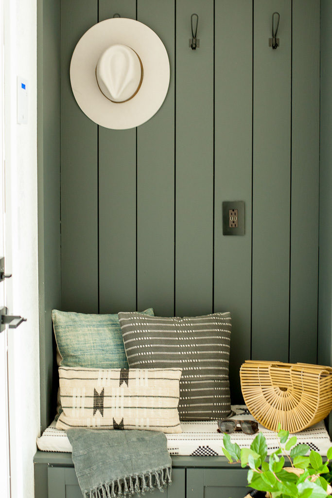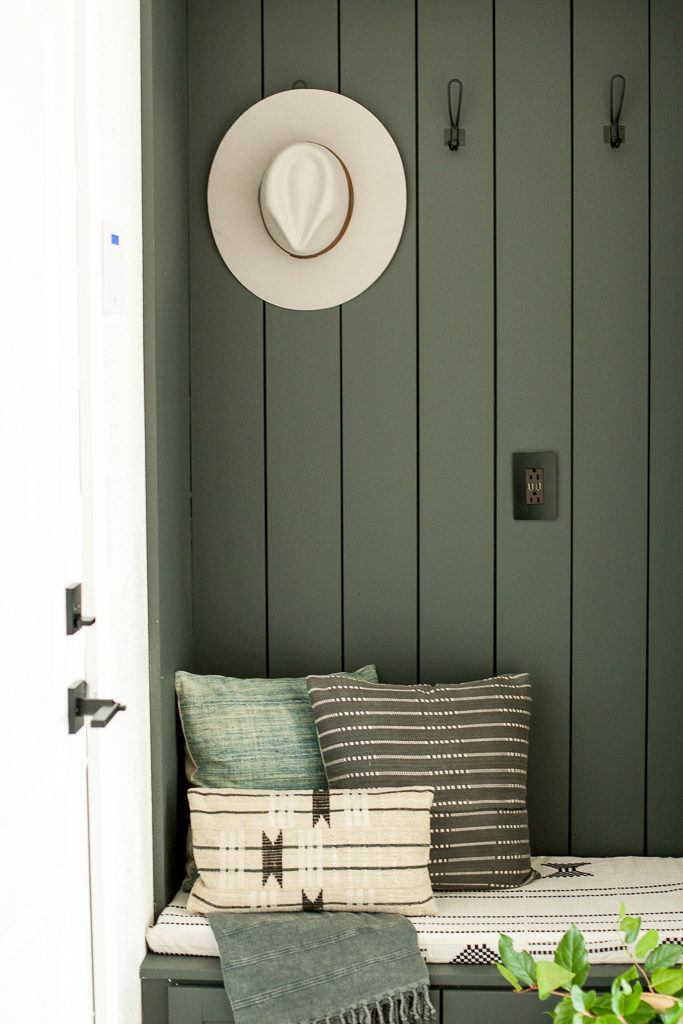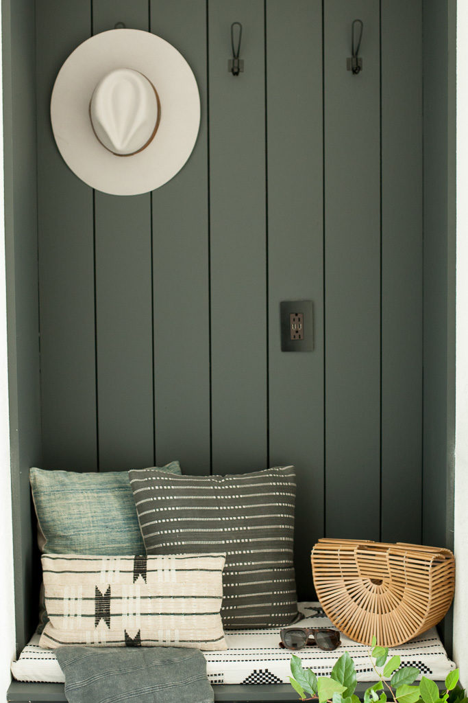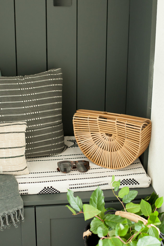 Now, the most critical part of this dropzone is it looking cute. Yes, functionality is important, blah blah, but it’s gotta be looking right at the end of the day. I turned to my pillow dealer, Monica from Boho Pillows to start pulling new textures and prints for the house. This was our 1st area to work with. My last house had a TON of her pillows, but we needed new ones to go with the black and white palette. She created a custom cushion, and corresponding pillows to go with it. Pretty cute, huh?
