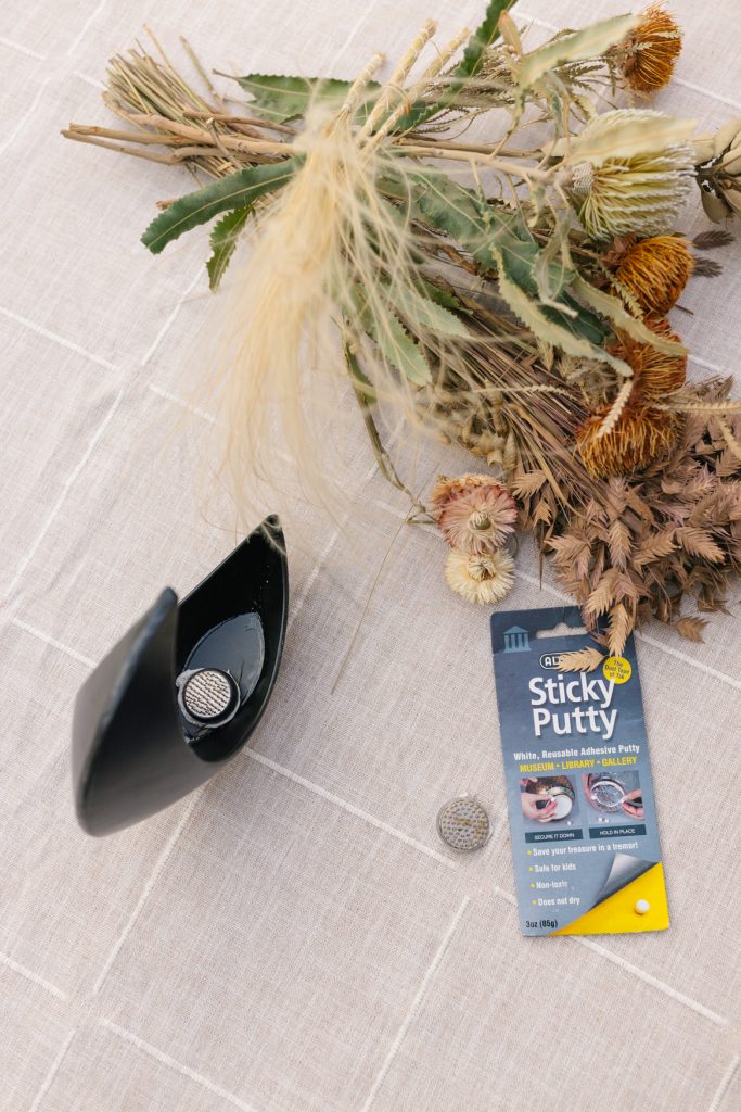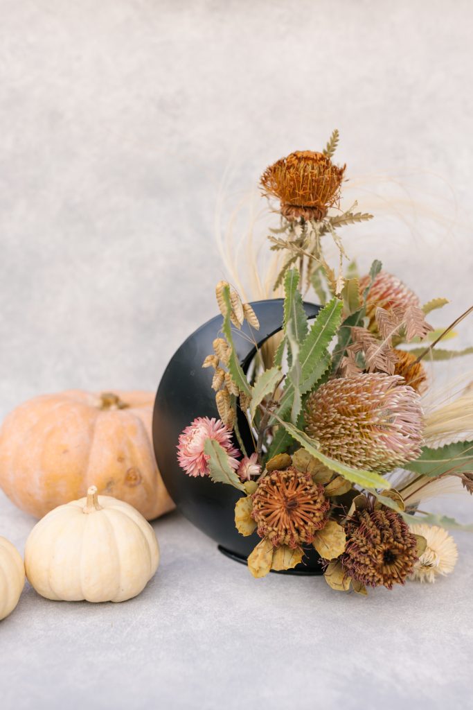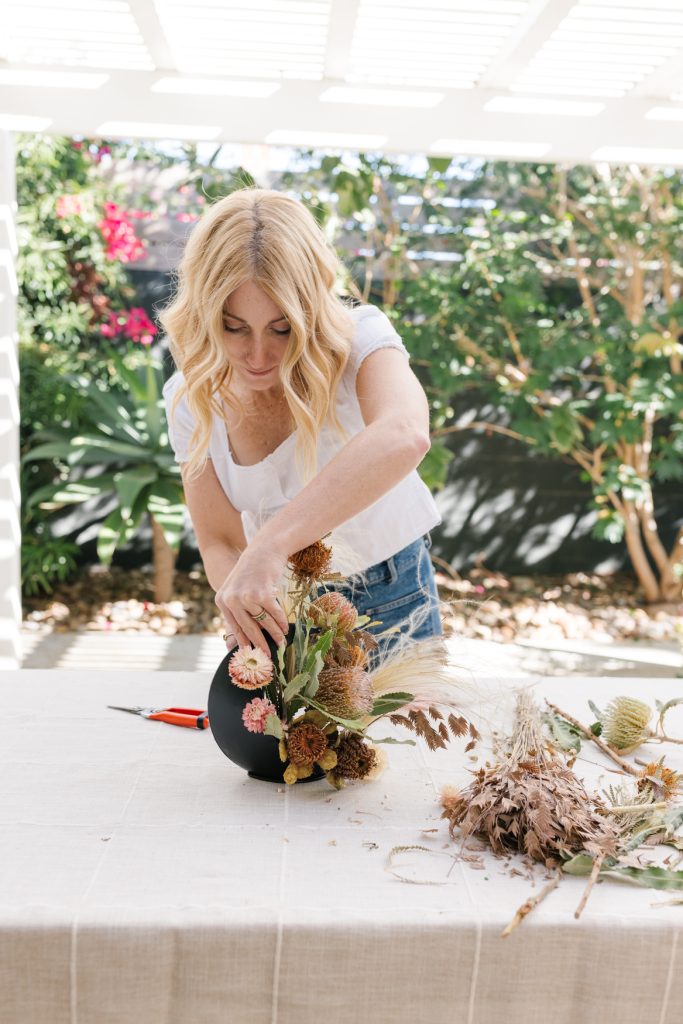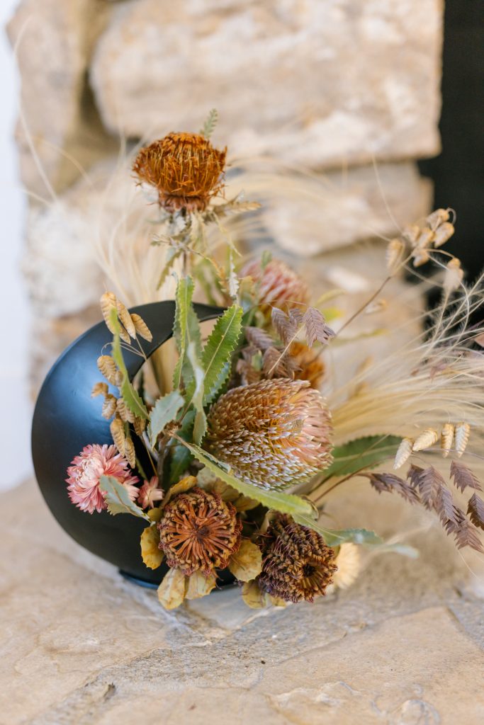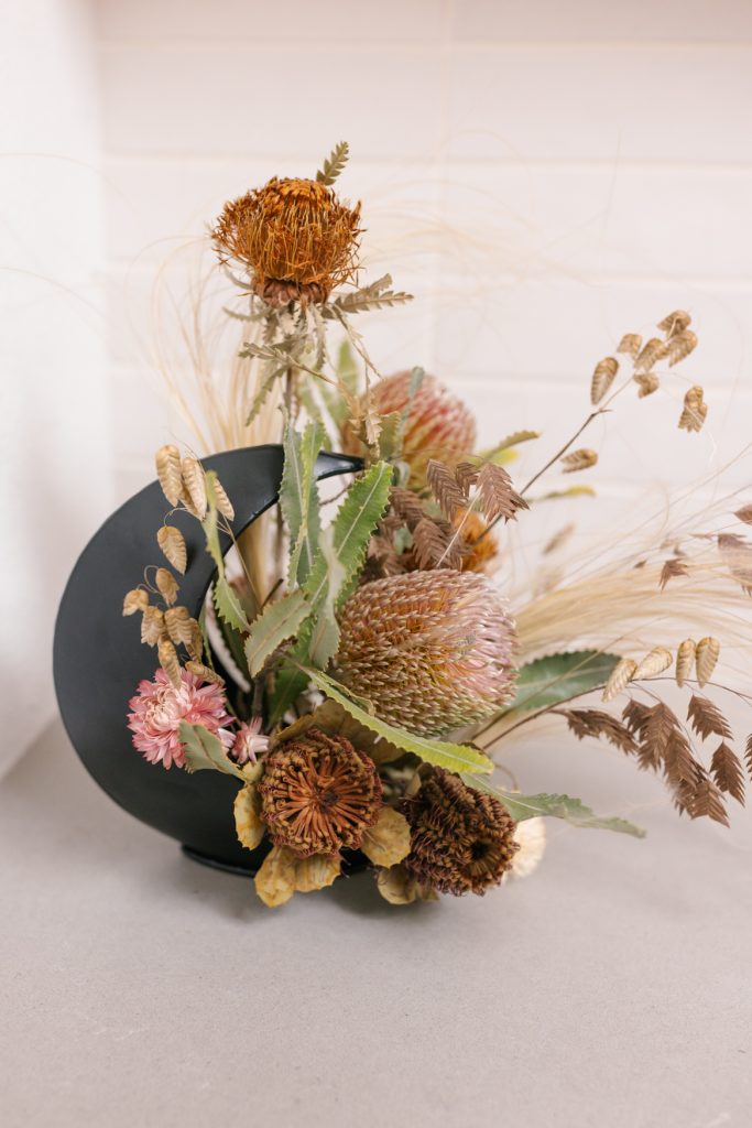 Stick various dried florals into the pins in the pin frog (no water needed). I used dried protea, banksia, strawflower, and grasses. Make sure to place the heavier florals towards the bottom of the arrangement and the grasses can be your taller floaty bits.