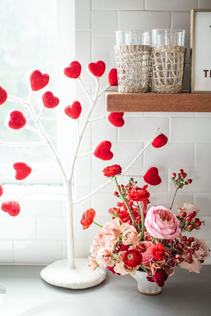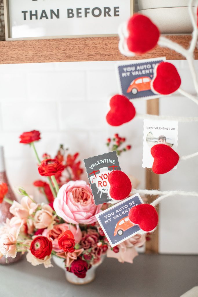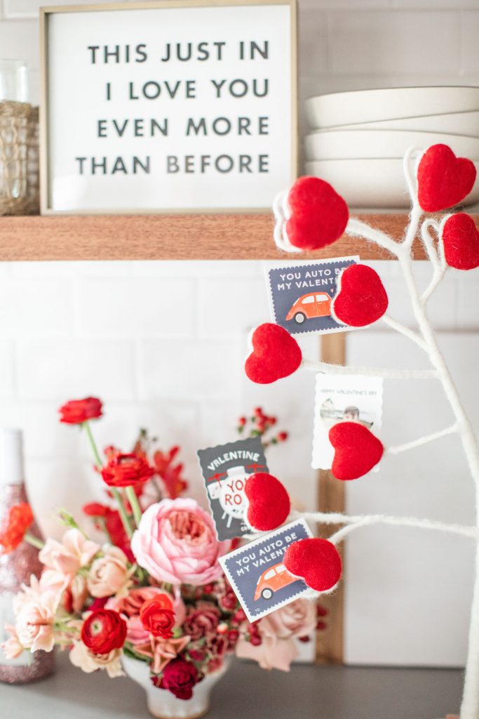 There’s something so nostalgic to see those balloons with the string hanging down!  They brought my kids lots of joy too!!  Pottery Barn Kids has tons of cute Valentine’s Day decor, I’ll get to the cute tabletop in a minute, but I fell in love with this Valentine Heart Tree the second I saw it!  Isn’t it a cute way to display your Valentine’s?!  I put a few of my kid’s own little classroom Valentine’s from Minted and now they’re so excited to put the Valentines they receive on there!