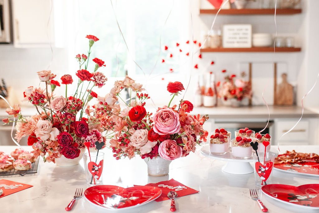 First things first, if I’m going to make anything pretty it’s going to need flowers!!  For this Valentine’s Day I turned to my friend Krista who owns Not Just in Novels.  She created these gorgeous red and pink arrangements and had me all giddy for Valentine’s Day!!