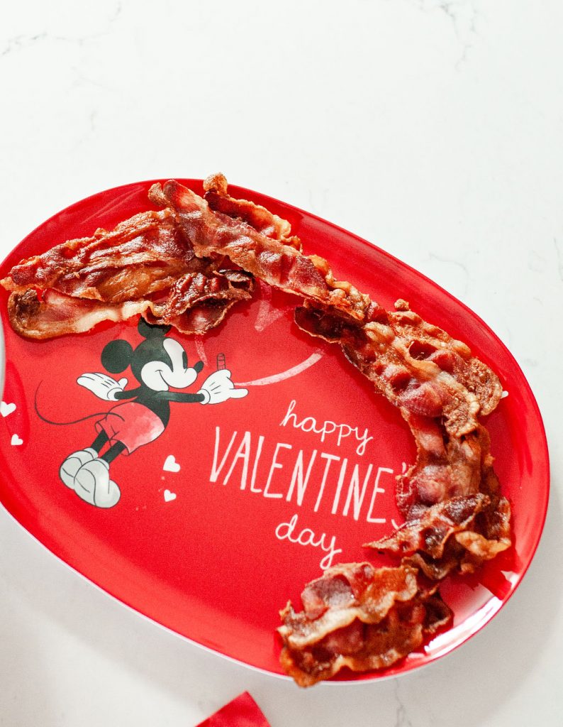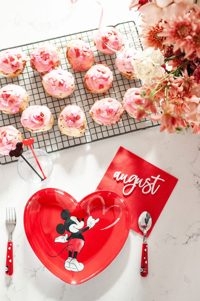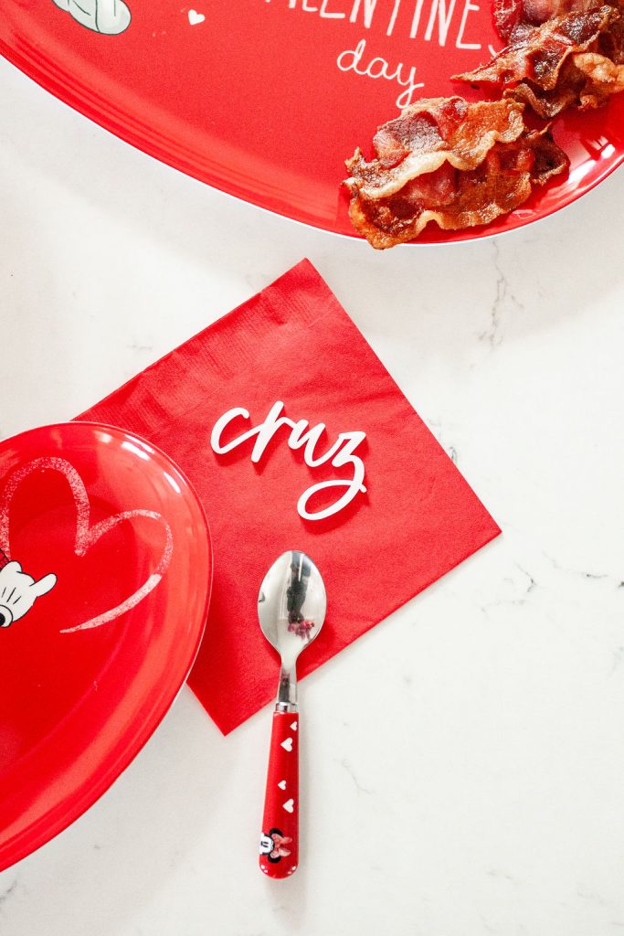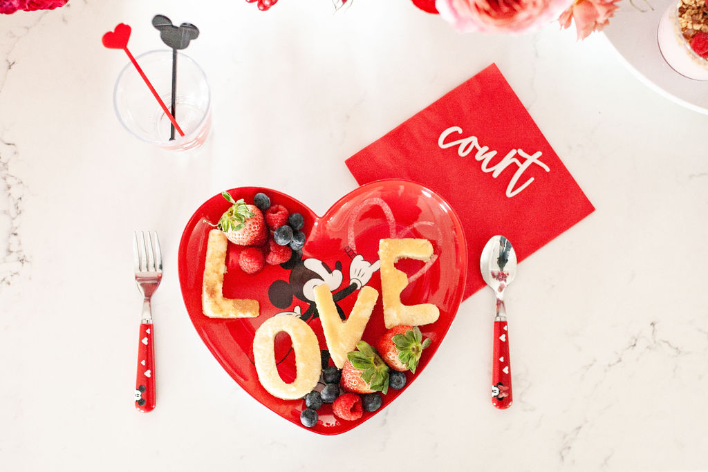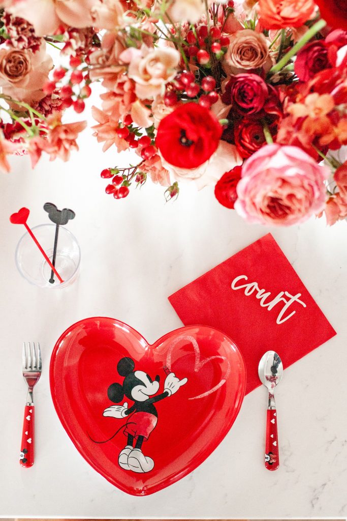 These cute Mickey heart plates, cups, and flatware created the perfect red Valentine’s Day tablescape.  I added red paper napkins, custom place cards that I bought last year for the holidays, and some fun Mickey & heart-shaped stir sticks from David & Leanna.  Yes, it’s a little extra but I love those details and think they make for such a fun tablescape.
