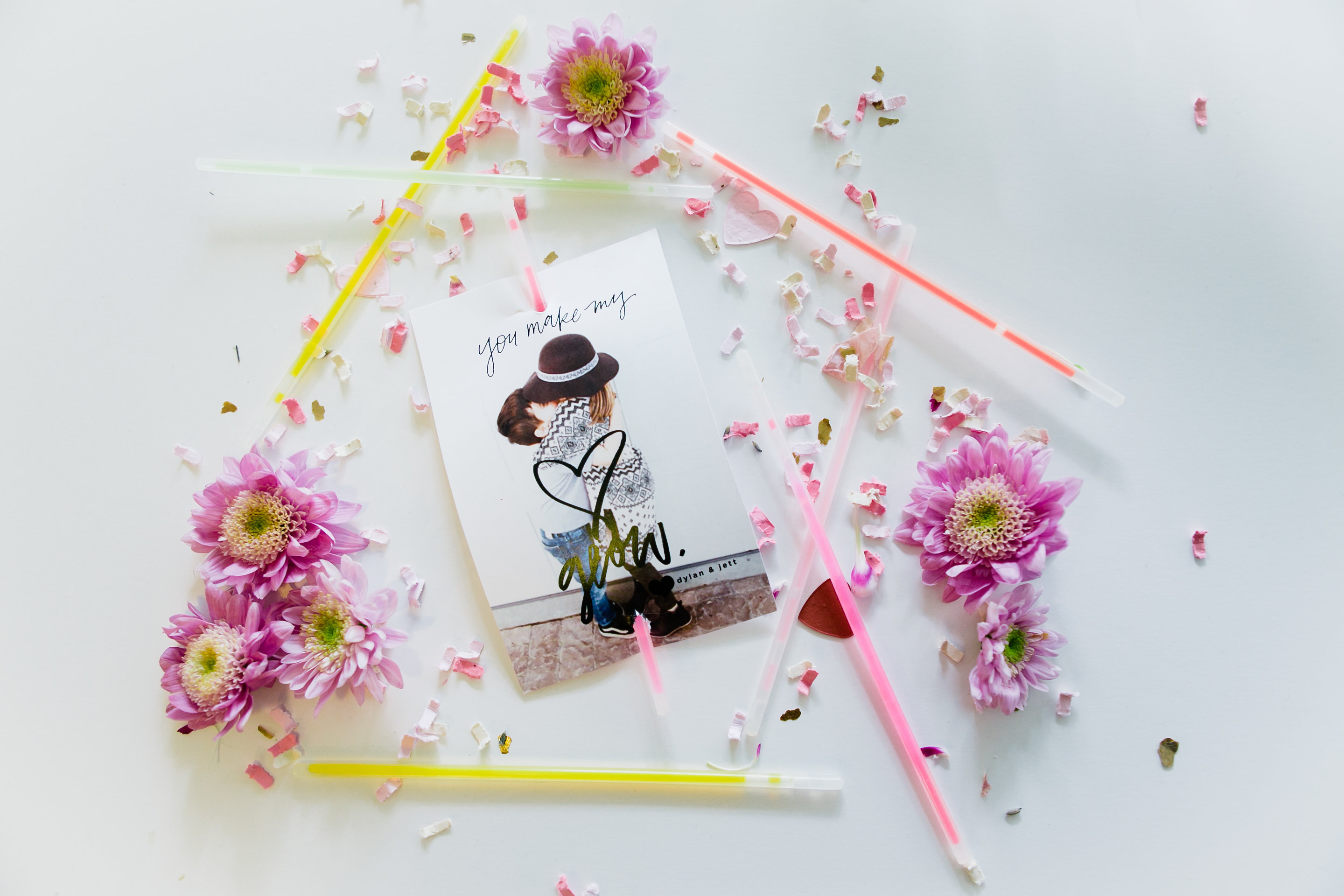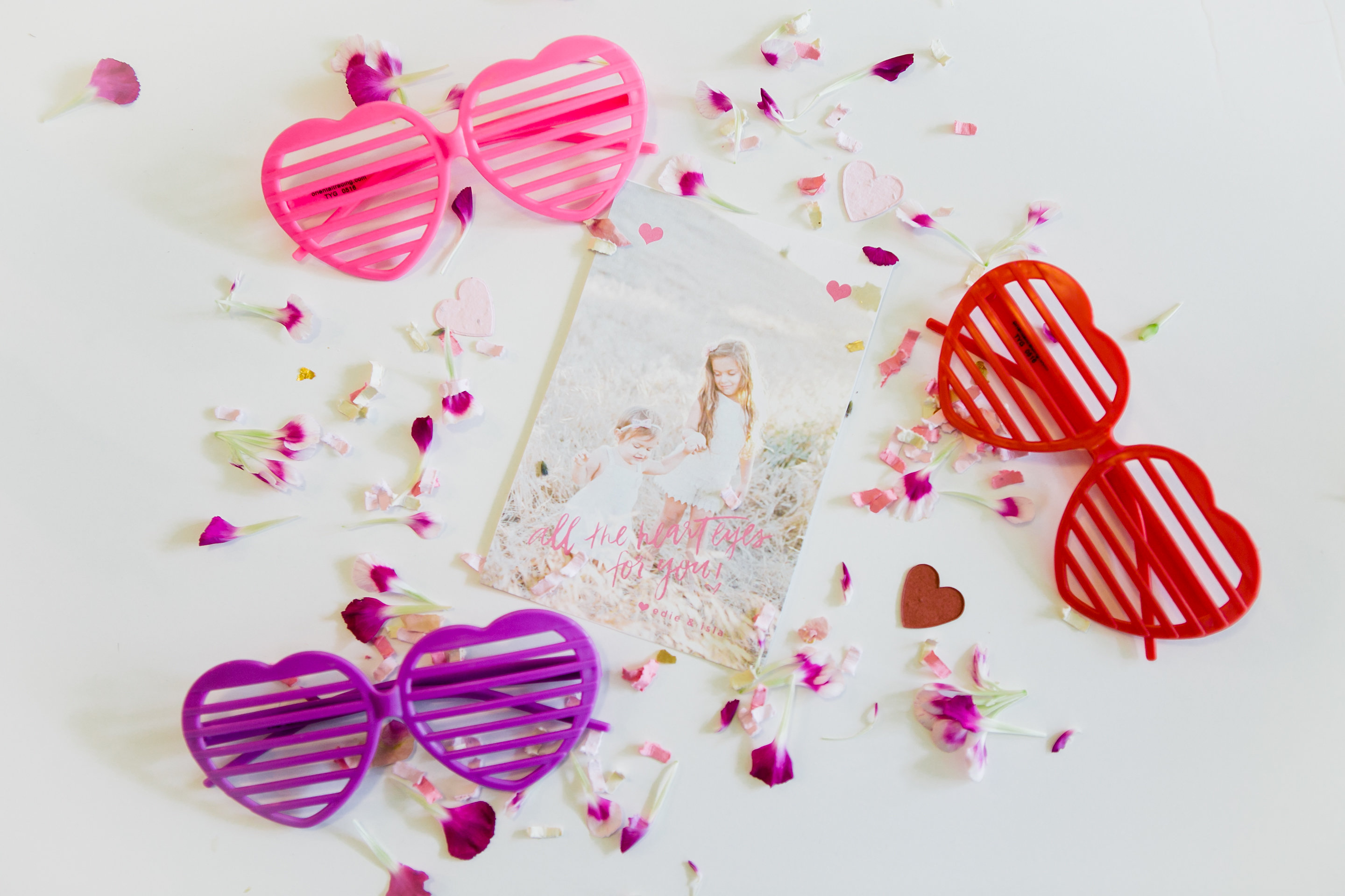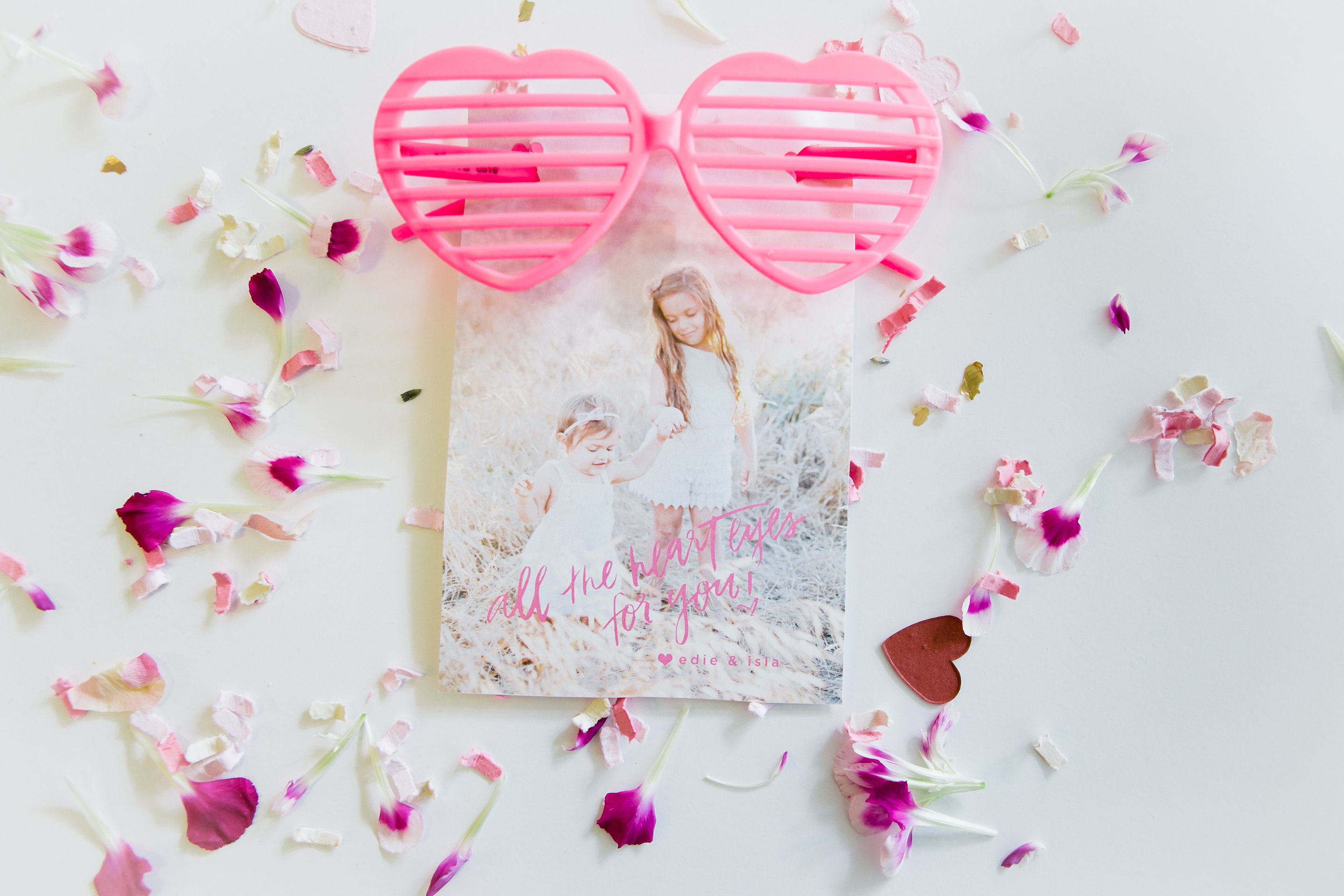 Leah decided to do a joint card for Edie & Isla, her two little girly girls! She found these adorable heart stunner shades online and knew they would be such a fun Valentine’s Day treat. They come in a variety of colors – not pictured are blue, so if you’re worried this is too girly don’t be! Every kiddo has fun dressing up and we can just picture how much fun these would be at a Valentine’s Day party!