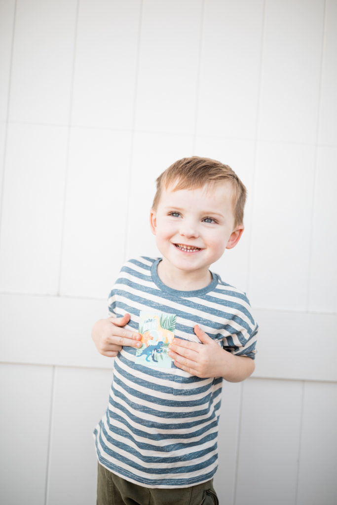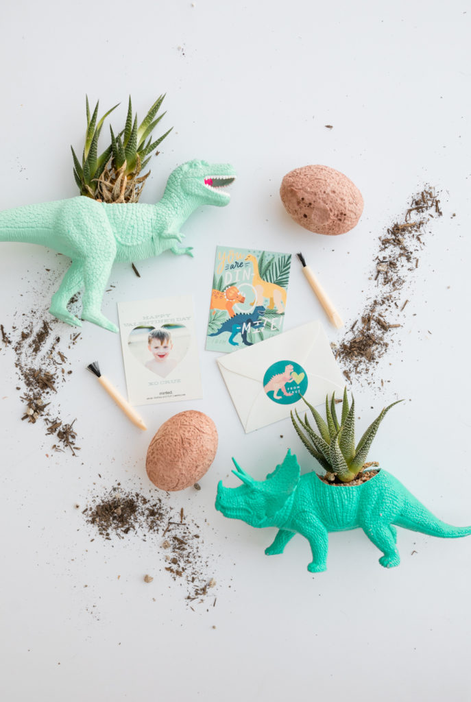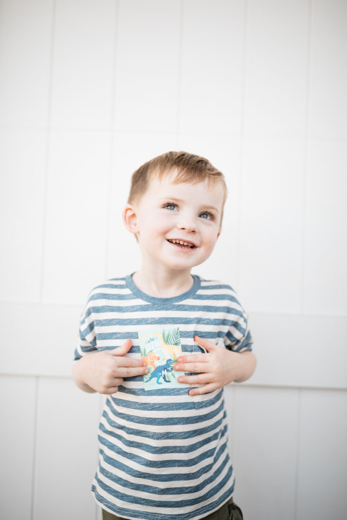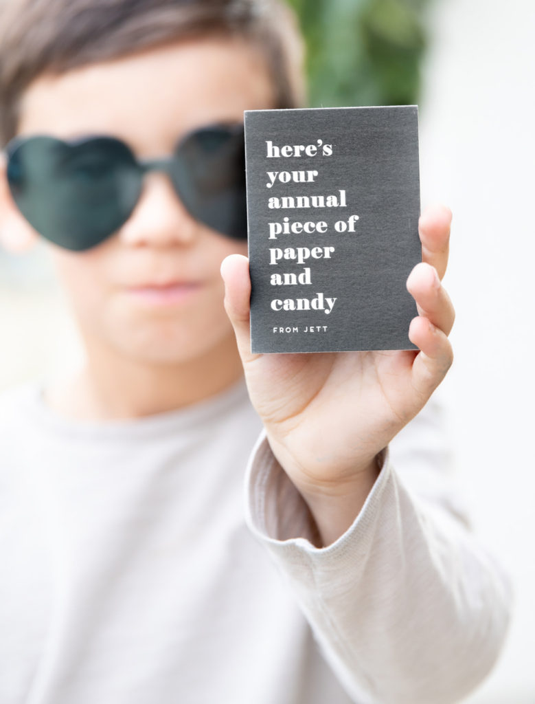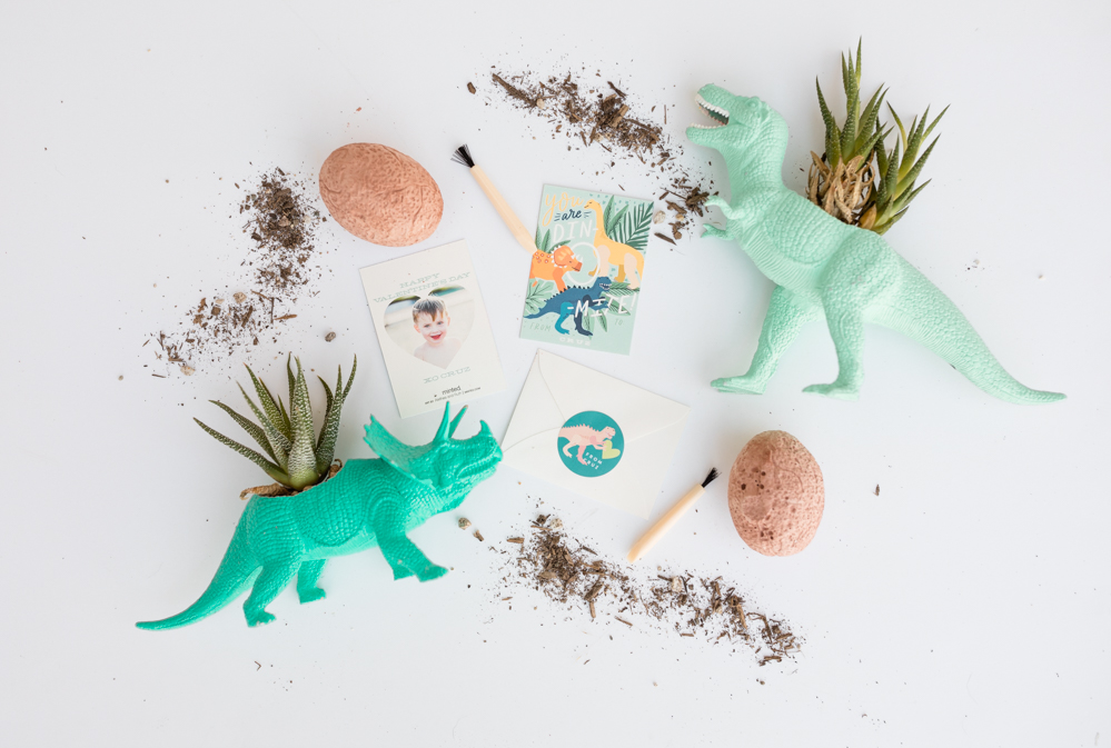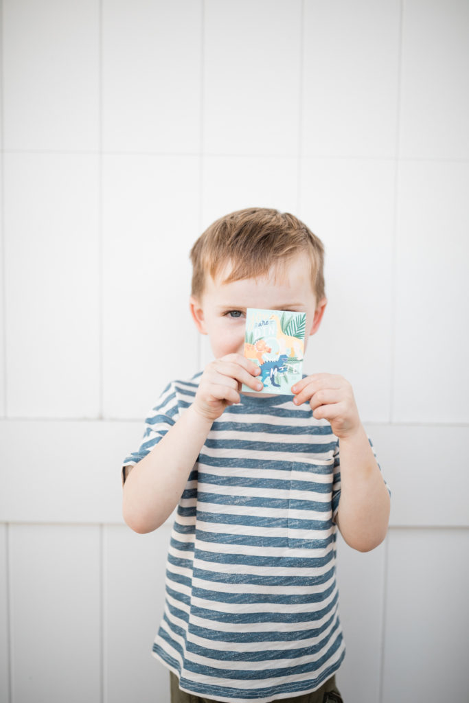Onto the boys!!! This time we are going youngest to oldest, starting with my 3 year old Cruz! Like any boy, he has a dino obsession! He chose this bright and colorful card that I really love and we are going to be giving away these dinosaur egg excavation kits! It’s a fun alternative to candy don’t you think?! He loved them and can’t wait to give them out! Oh, and if you look closely I did my kiddo’s photos on the backs of their cards, I think it’s a cute touch and fun option Minted offers…
