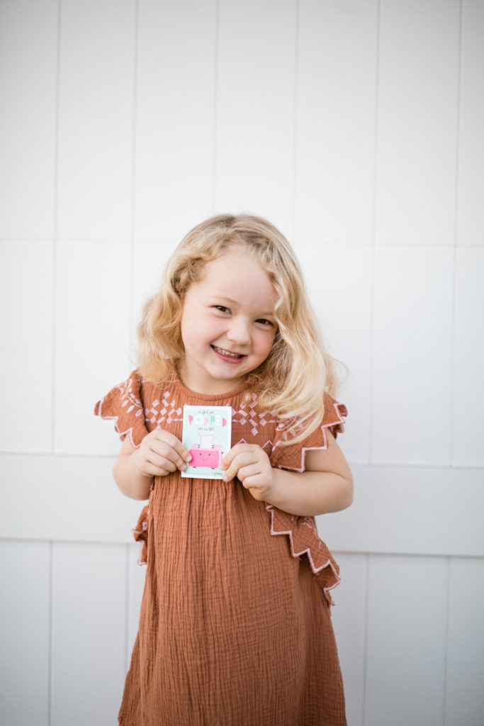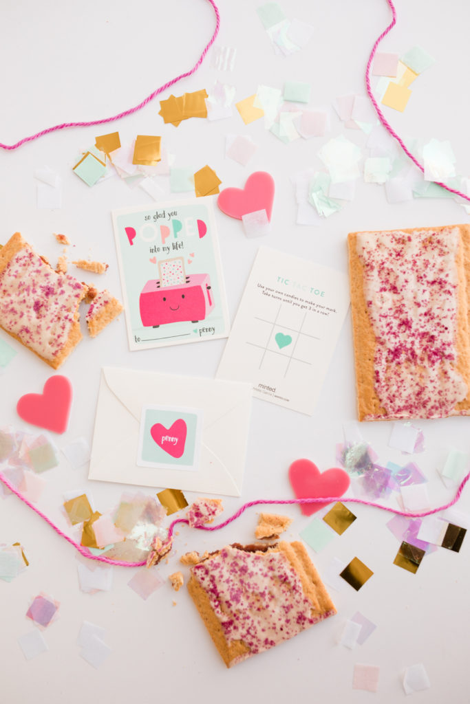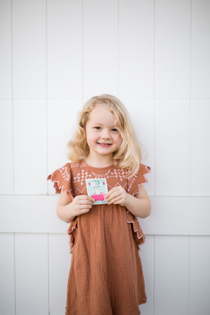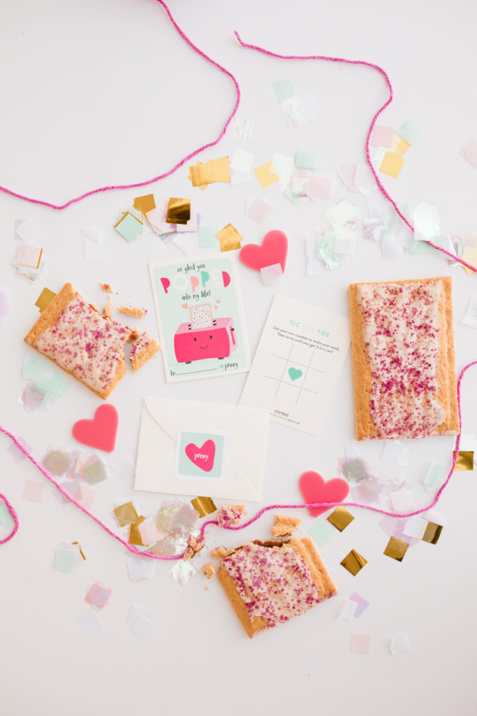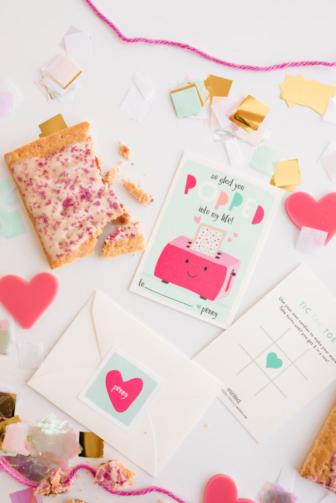 Olivia’s little sister Penny who just turned 4 is ready to pop on over with her Valentines… Pop tarts were her treat of choice, of course her mama helped get the organic Trader Joe’s kind! I love the turquoise and pop of pink (pun intended) on the card! Also, did you notice that all of the Valentines chosen so far have tic-tac-toe on the back?! Extra fun!!