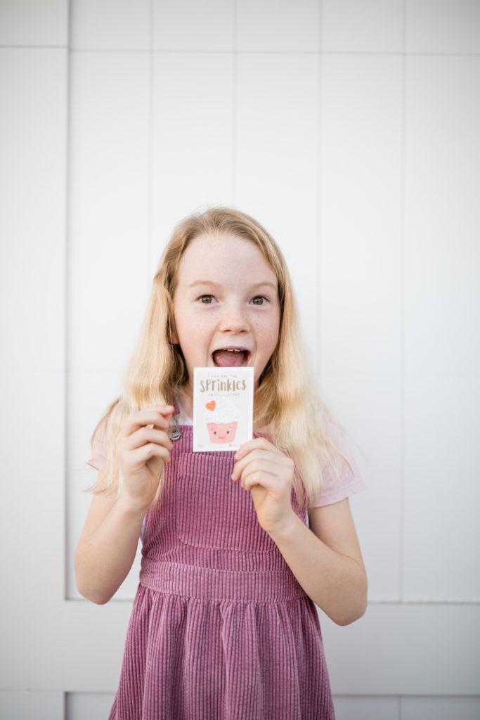 Onto Olivia, Alison’s almost 8 year old daughter. Olivia is in the 2nd grade and chose this cute Sprinkle card, I especially love the gold foiled writing! Such a fun & fancy touch on a Valentine, really makes MY Valentine cards as a child that you had to punch out of a sheet… She plans out handing out baggies of sprinkles and I think she will be the most popular girl in the school after that!