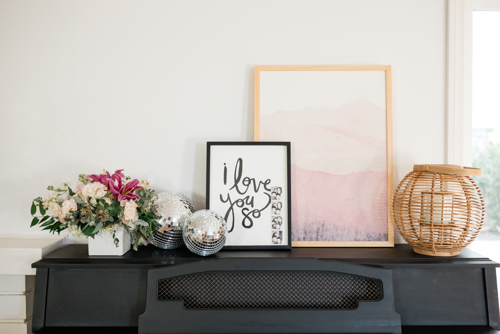 But I needed something behind it and I wanted it pink for the day of love!! I found this beautiful Mountain Range print by Sadie Holden and thought, that is perfect!!! Lastly, adding a beautiful arrangement from Teleflora and disco balls and this is one happening spot!