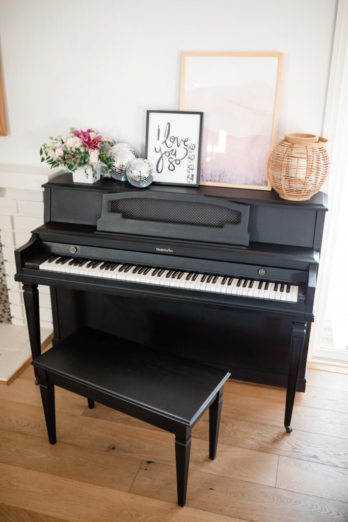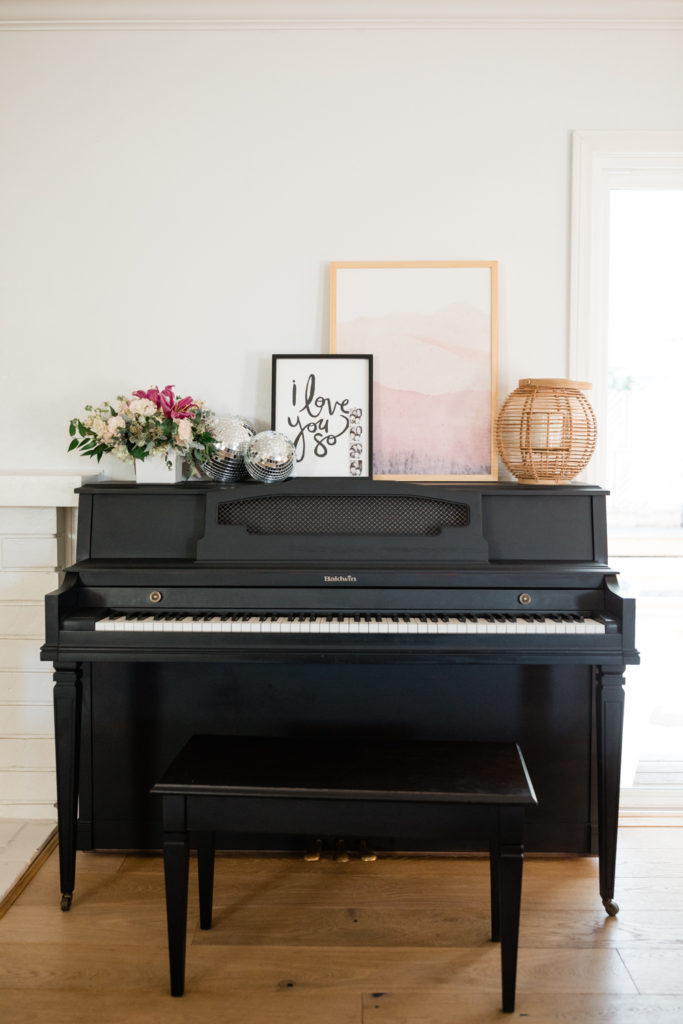 Last but not least, my family and I got a new piano for Christmas and I wanted to dress it up for Valentine’s Day! I got this cute I Love You So print by Kelly Ventura last year and since I love it so much, it now sits up in my house year round. We added a photo booth strip of my husband, kids and I to it which I love.