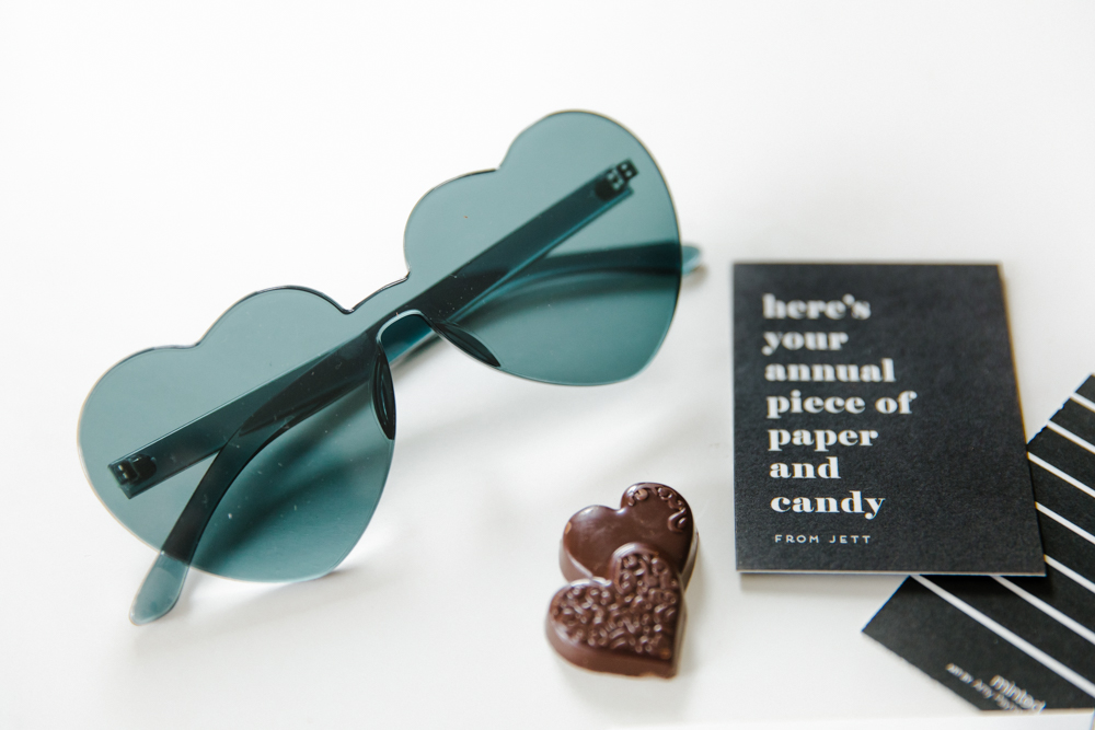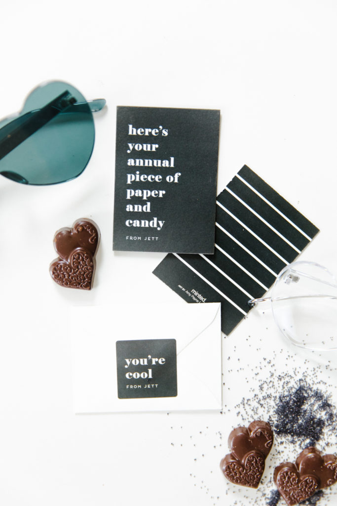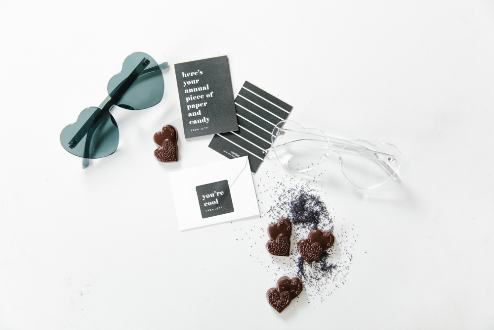 Last but not least is our oldest boy Jett who is 7 going on 8! He’s Mr Big stuff these days and is too cool for some of this stuff, so of course he went with this card! Pretty much sums it up, don’t you think?! Since it’s sort of dark humor, Abby went with dark chocolate! She also found the cutest black heart sunnies that go perfectly…