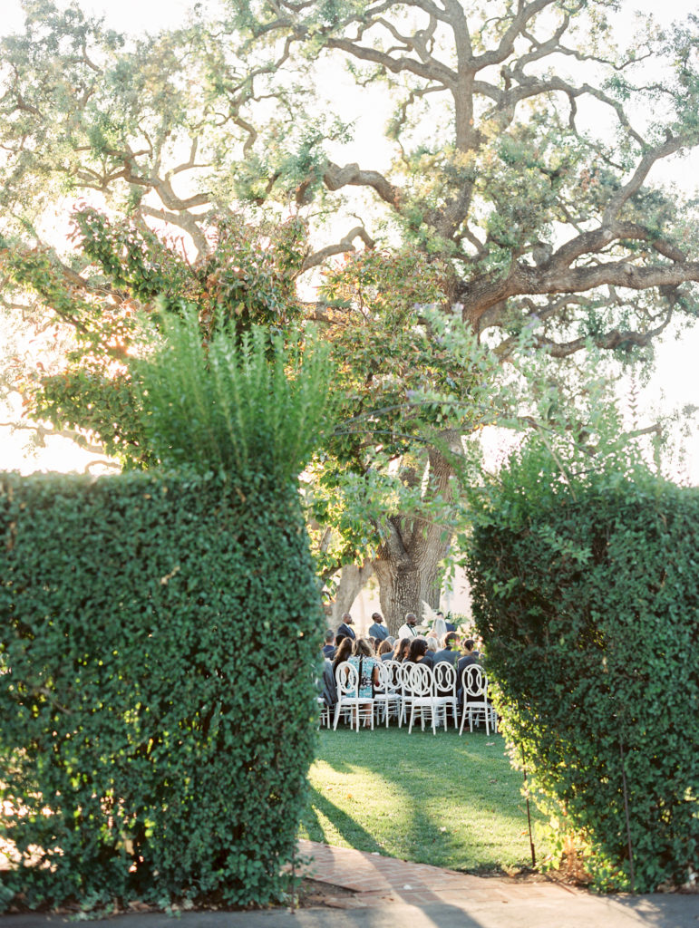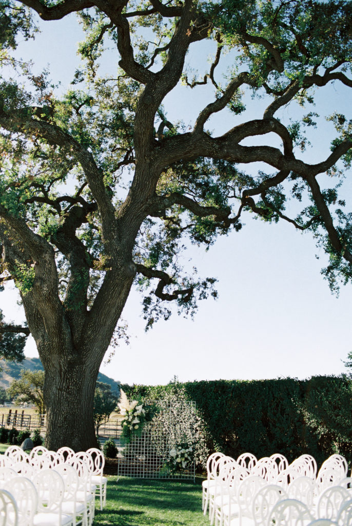 The aesthetic for this wedding was so fun and modern, I love the whole vibe Violet was going for. Bright, clean, and romantic. The ceremony was nestled under a giant oak tree, there are a ton of them on the property that are just gorgeous! Violet chose the white Orion chairs from Stuart Rentals that definitely made a pretty statement.