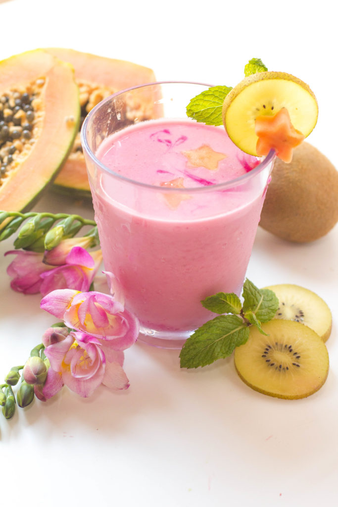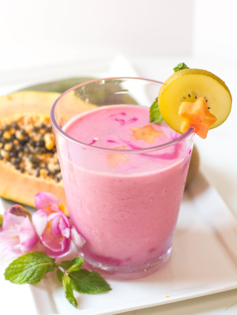 With summertime around the corner and this weekend being a holiday, all I can think about is a cold frozen treat poolside. Who’s with me? With any holiday weekend, I like to get a little festive, and this watermelon and papaya smoothie is a crowd pleaser. Watermelon and stars are the first things that came to my mind when thinking about Memorial day. Well that and bbq, but I don’t think anyone wants me to try and make a pulled pork smoothie! With the weather being so darn hot, this is the perfect cocktail to cool down with and be festive all weekend long. Plus, I might have made a sneaky little treat out of those stars.