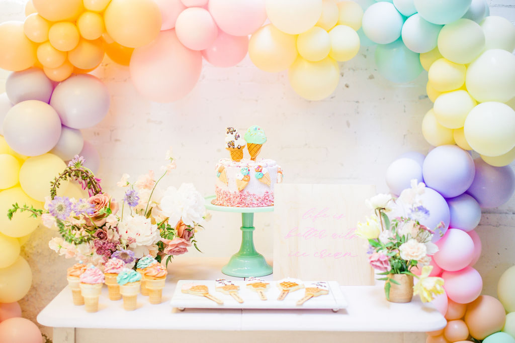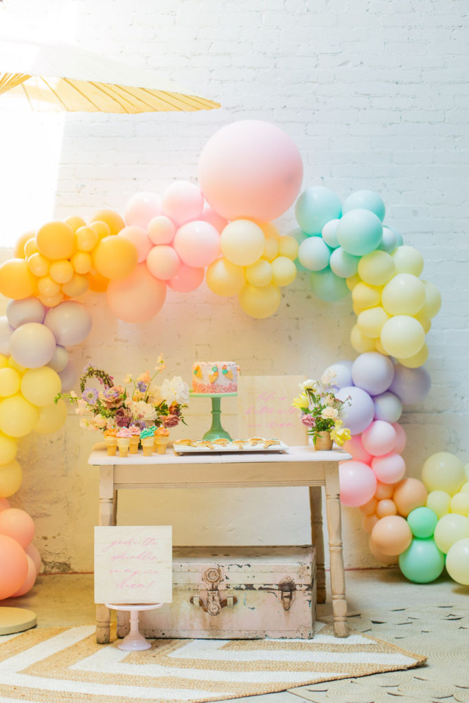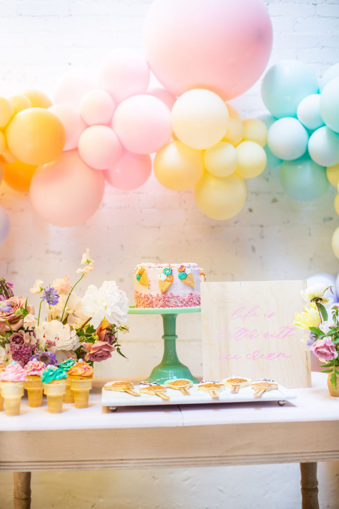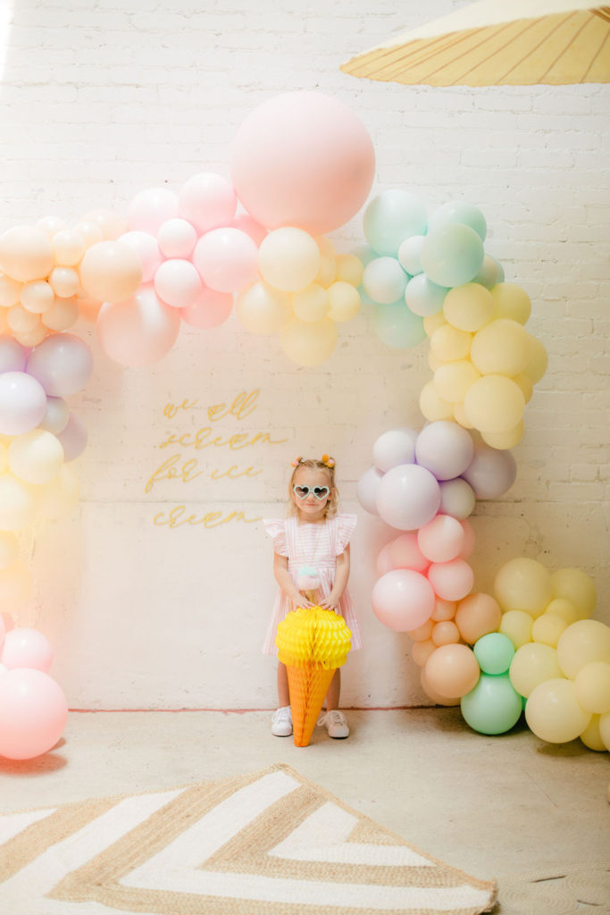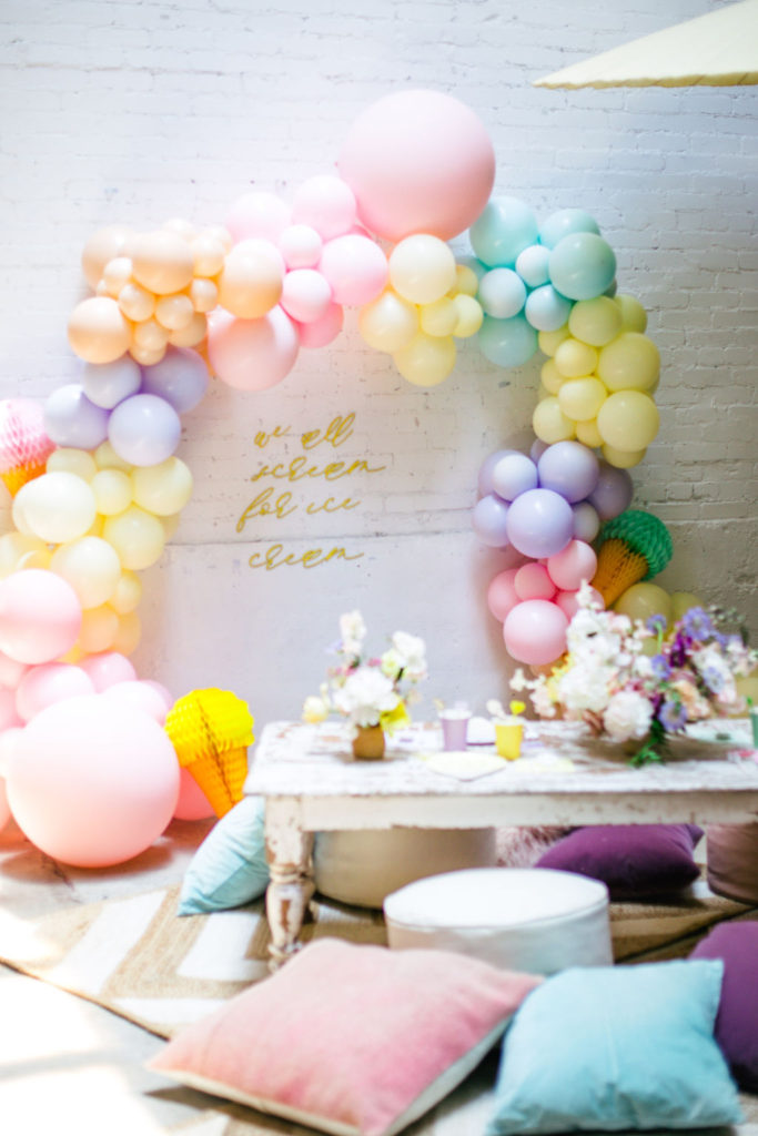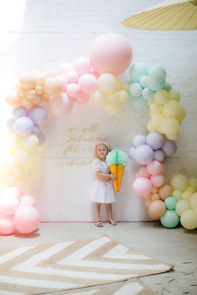 The prettiest balloon arch I ever did see! Such fun colors and they all look so cute together. What can I say, Ellen at The Pop Shop is incredibly talented! We added these honeycomb ice cream cones from Oh Happy Day Party Shop because they are crazy adorable…