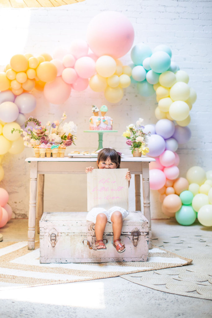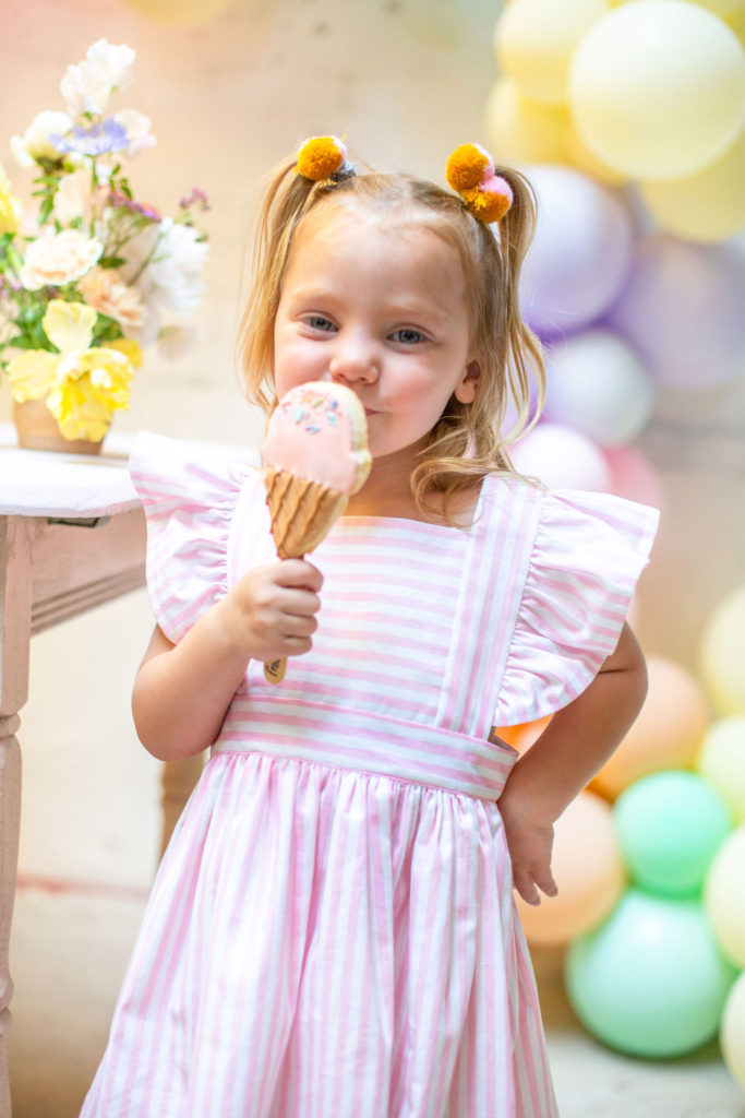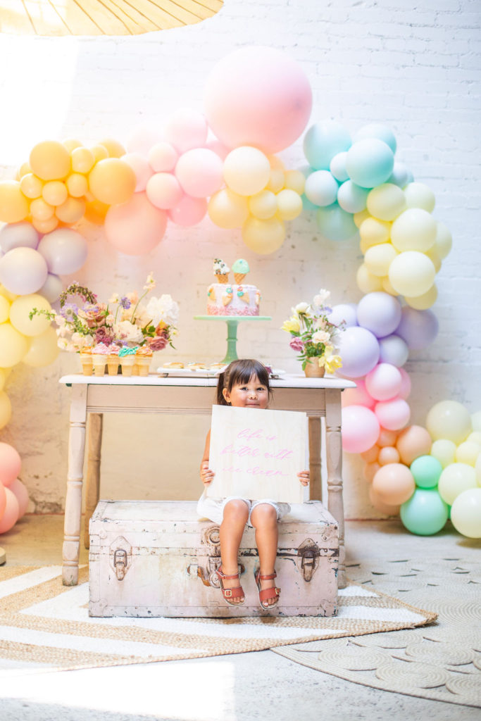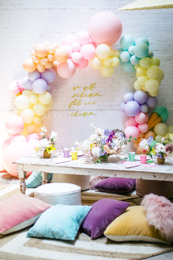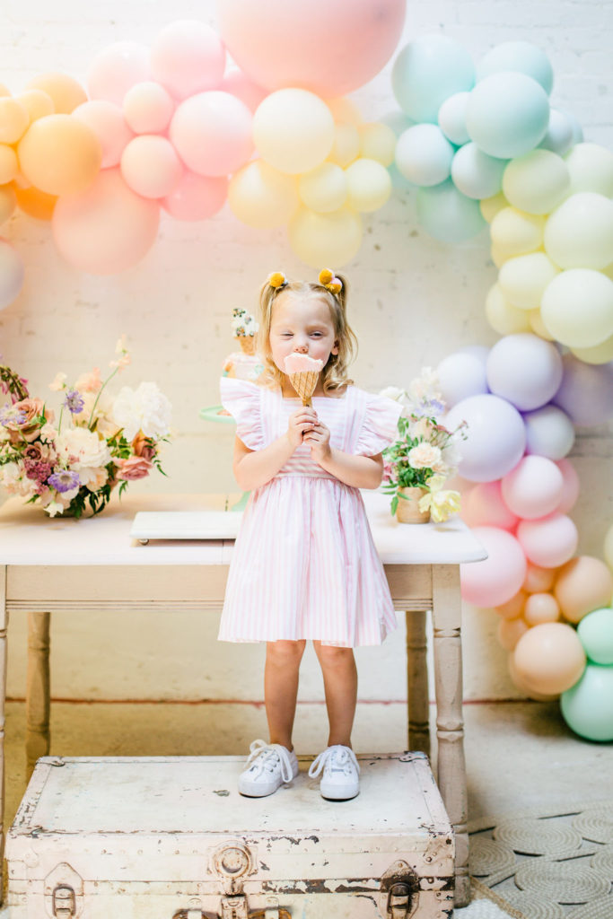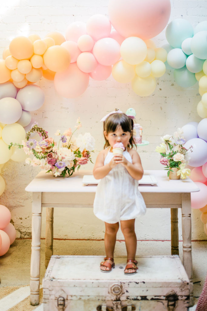 The prettiest balloon arch I ever did see! Such fun colors and they all look so cute together. What can I say, Ellen at The Pop Shop is incredibly talented! We added these honeycomb ice cream cones from Oh Happy Day Party Shop because they are crazy adorable…