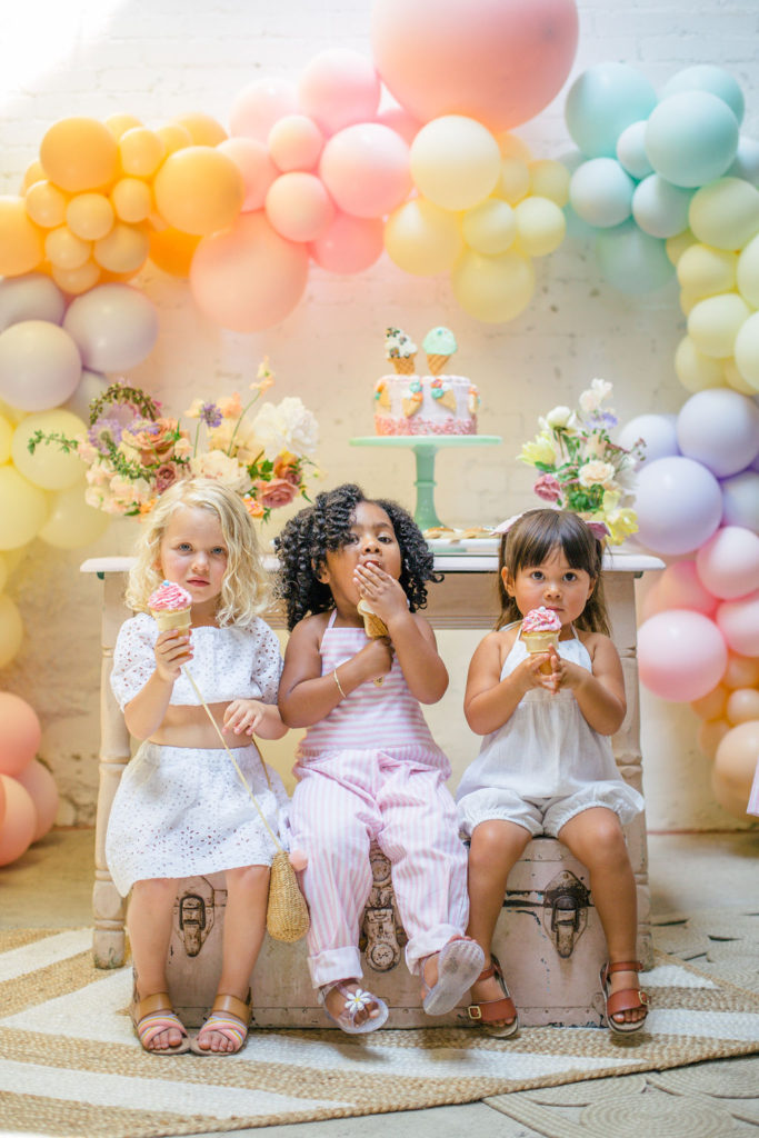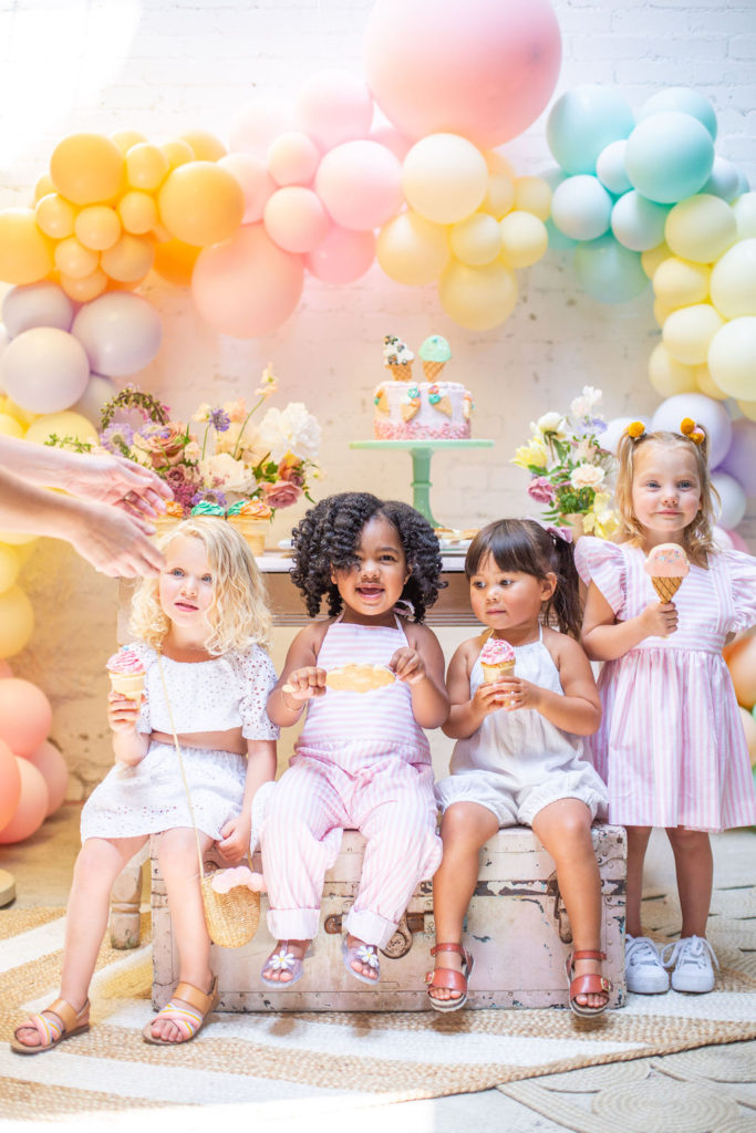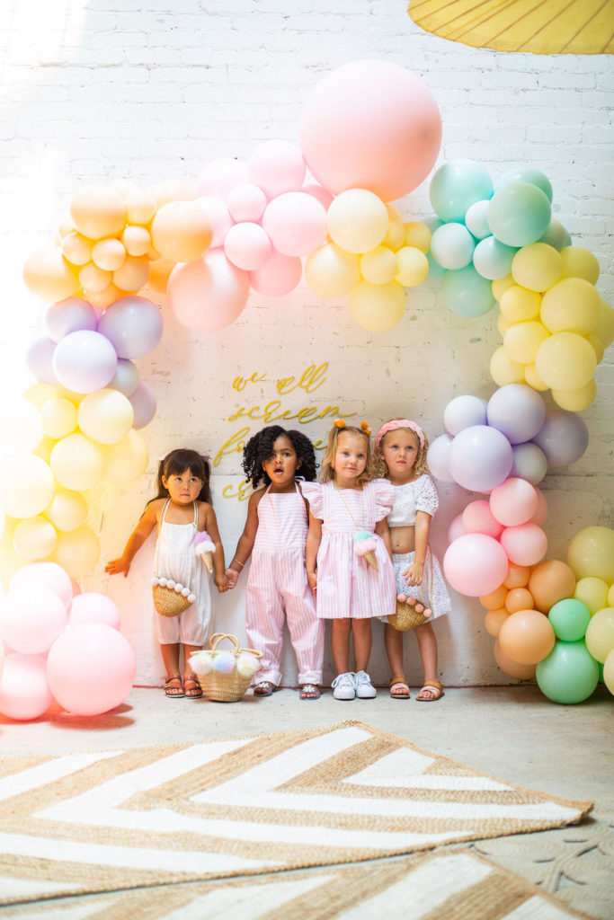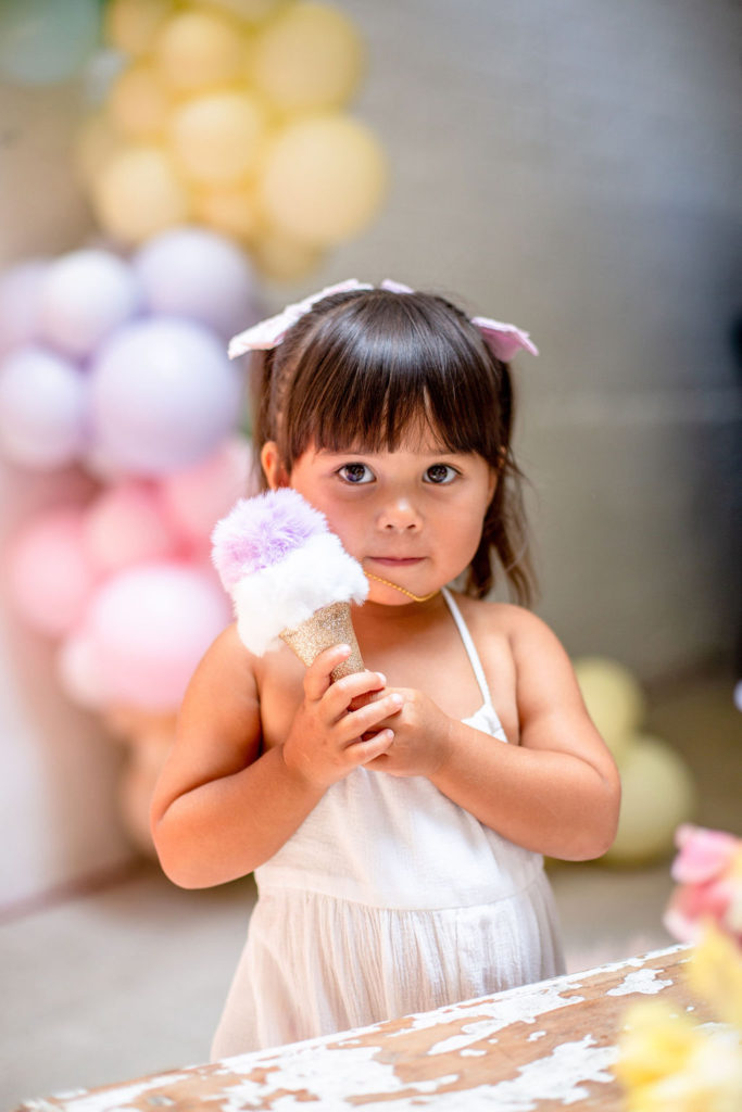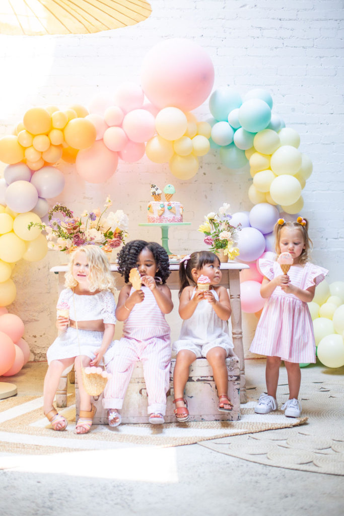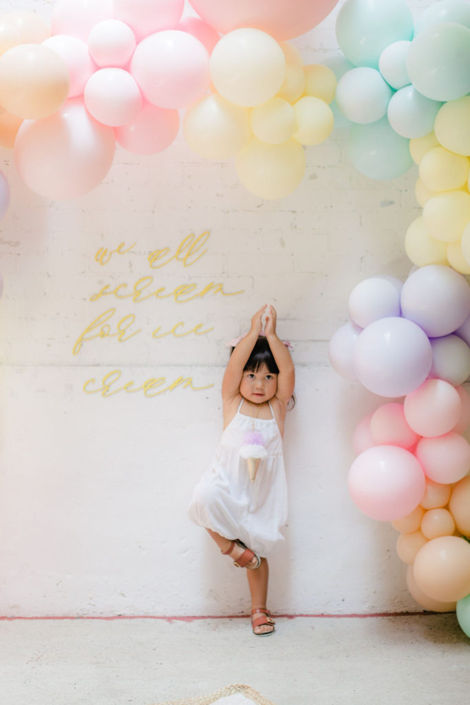 The prettiest balloon arch I ever did see! Such fun colors and they all look so cute together. What can I say, Ellen at The Pop Shop is incredibly talented! We added these honeycomb ice cream cones from Oh Happy Day Party Shop because they are crazy adorable…