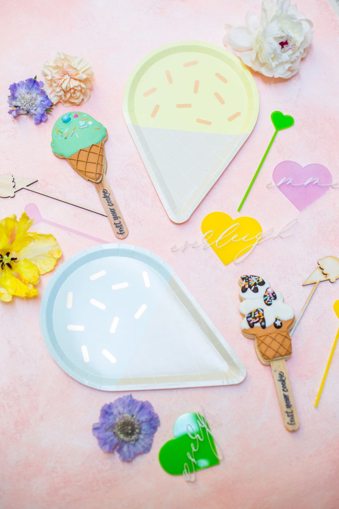 I love these sweet gelato plates from Oh Happy Day Party Shop. I used this set’s colors as inspiration for the entire shoot. Plus, how can you not love all of the cute details from David and Leanna and the cookies from Frost Your Cookie?! Details are my favorite!!