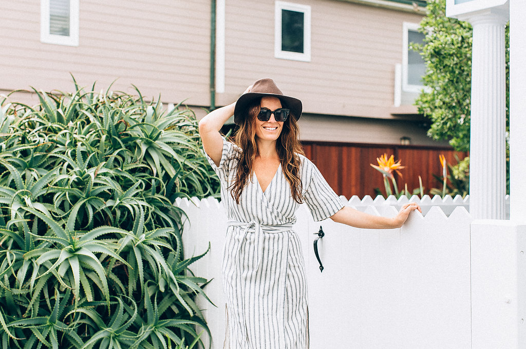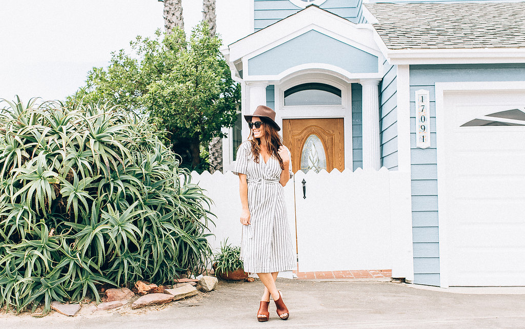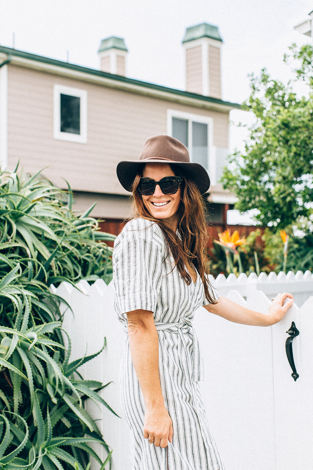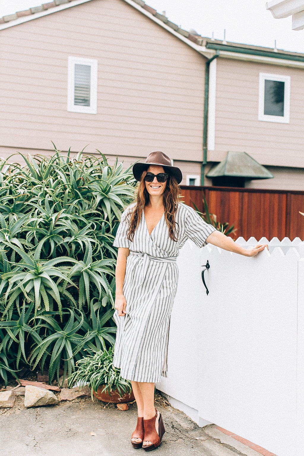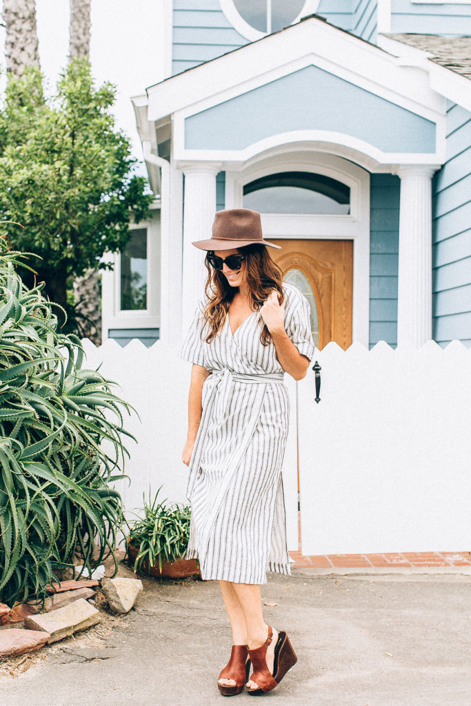 A good vertical stripe is always flattering, and stripes never go out of style. This Tularosa dress caught my eye, I liked the fact it had a sleeve and could be worn casually or dressed up. To make it less summery I paired it with a fedora from Brixton, then I added some old wedges that I have by Elizabeth & James. They are years old, but I still love them….