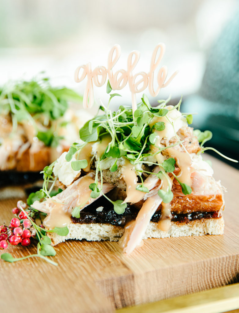 Then pile it on! I start with the bread and toast it with a little butter (vegan) and a little salt and pepper. Trust me, its good! Then PILE on the cranberry chutney. You can use whatever cranberry sauce you have! Next, comes the turkey. Pile it nice and high. I like to make a criss-cross pattern with the meat. Follow it up with the mash potatoes and stuffing. Then gently top drizzle the gravy over. I like to add some on the side as well for dipping.
